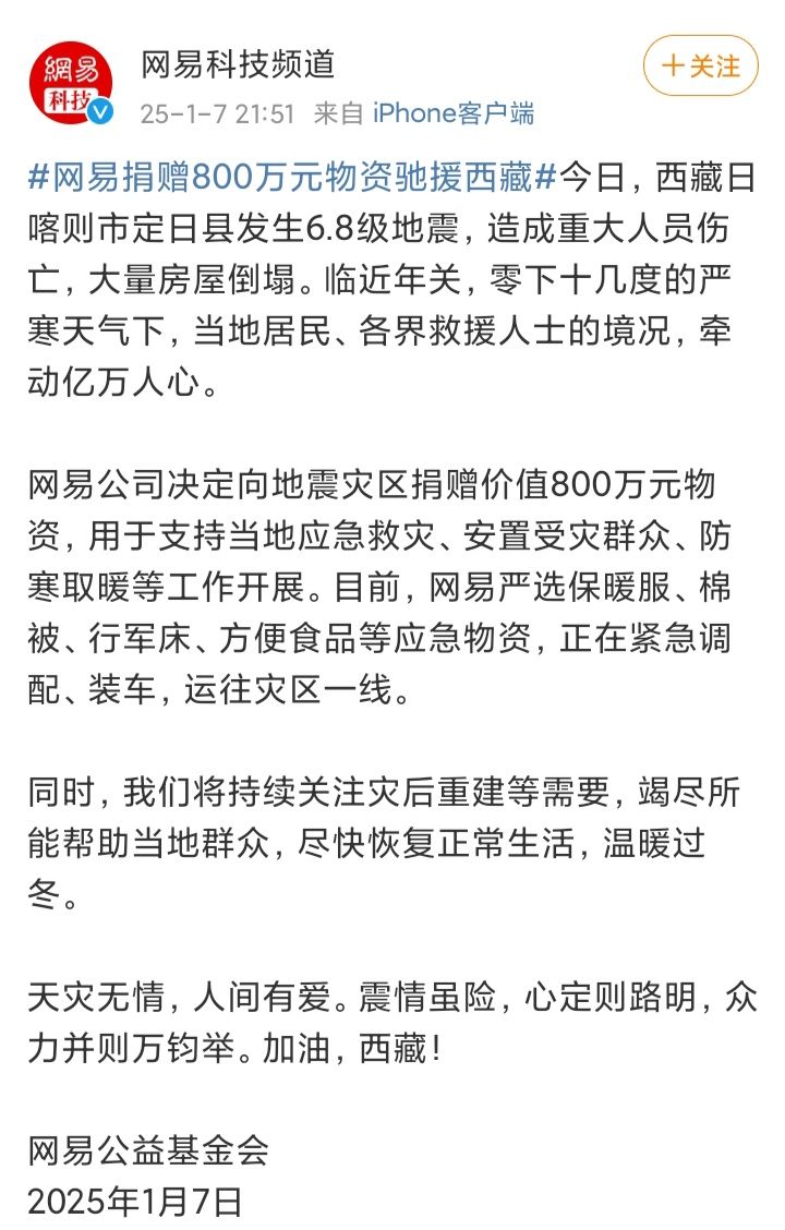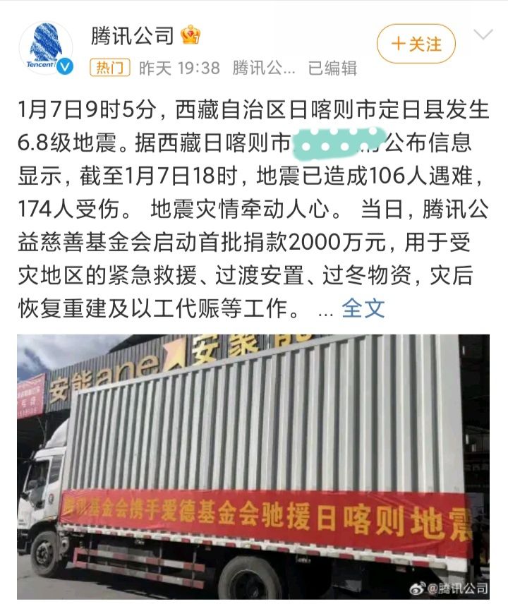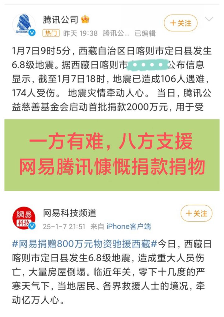 1/7号晚,网易、腾讯先后发文宣布,给地震灾区人民进行捐款捐物❗❗❗腾讯首批捐款就捐2000万元,网易则是捐赠了800万元物资。虽然游戏问题该骂,不过就冲这爱心捐赠,也值得点个赞不知道大家怎么看?#今天游戏圈发生了啥 #资讯评论员 #游戏资讯 #腾讯游戏 #网易游戏