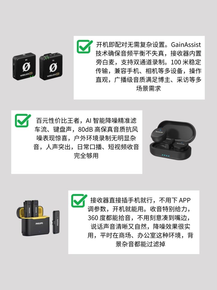 记住 3 个技巧,音质直接封神! 第一,无线优先!2.4G 传输稳定不卡顿, 单人拍一拖一,双人拍一拖二! 第二,看接口!苹果选 Lightning,安卓选 Type-C, 相机用户直接选 3.5mm 接口,不用后期! 第三,续航降噪别忽略!续航 6 小时以上, 智能降噪能过滤风噪车流声,户外收音也清晰! 最后提醒:别买几十块的杂牌,降噪差到哭! 百元价位足够新手用,冲就完了!” #无线麦克风 #