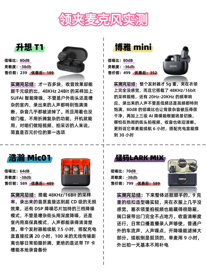 想入手领夹麦克风的朋友看这篇!整理了 12 月最值得买的领夹麦榜单,从百元到千元档都有,按需求闭眼挑不踩坑👇 🌟 百元档首选:升想 T1(¥189) 评分 9.1直接封神的性价比之王!累计优化 10 + 版本,硬是把旗舰级 80dB 高信噪比塞进了百元机里 —— 要知道这配置在千元麦里都算稀有款。全指向收音清晰,降噪能力直接拉满,500 元内预算闭眼入,学生党、新手试水必冲。 🚀 专业级标杆:大