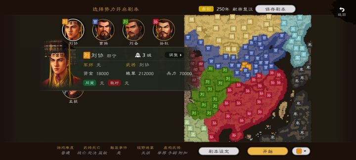 【剧本介绍·杜撰】自衣带诏泄密后,牵连的人都被曹操一个个划掉了。经过连年征战已成三国鼎立之势,但献帝复汉的心一直没有熄灭,刘皇叔已经坐拥西蜀天府之城,刘协计划里应外合联合刘皇叔给曹操致命一击!剧本配置:1、地图采用资帝原创地图(群相册已上传捏图过程)2、为了照顾新玩家,本剧本只需开通自创地图和自创武将即可玩。剧本设置:1、刘协开局(洛阳加强,把平阴和新郑改为大城,这样就有三城开局),极