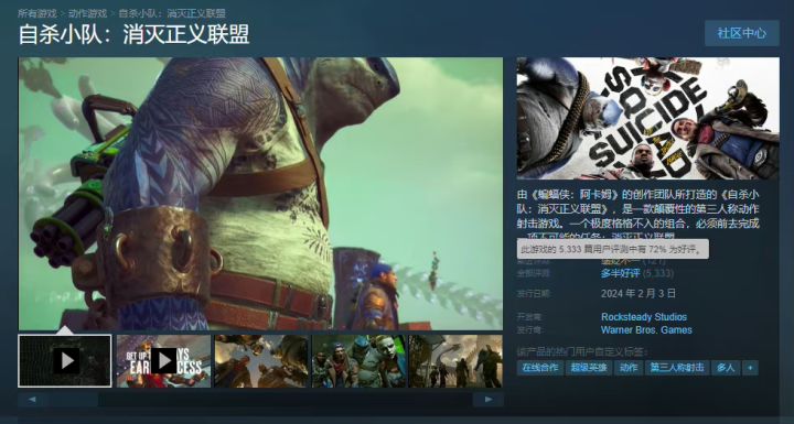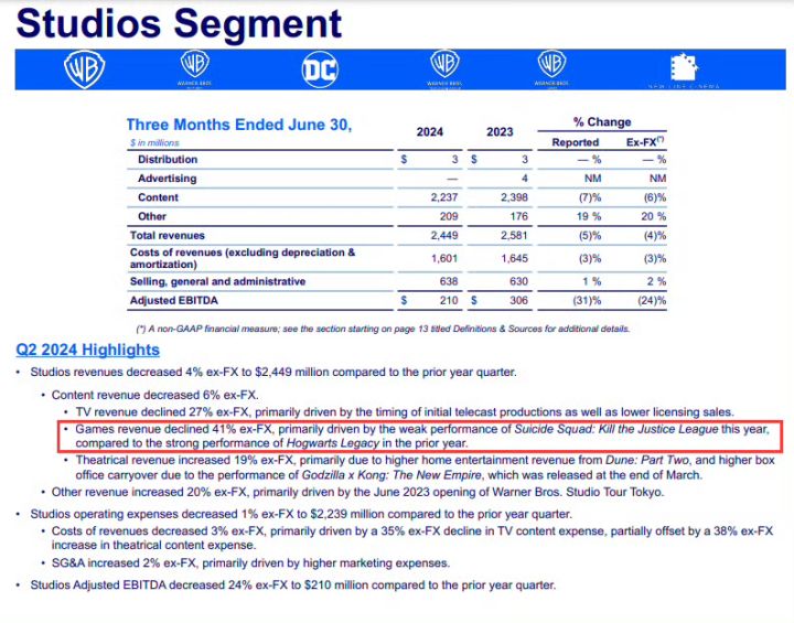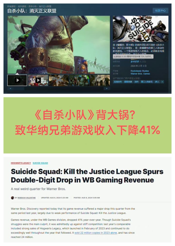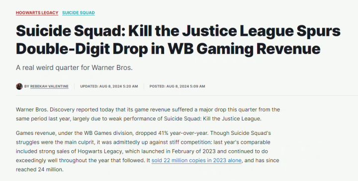 8/8号,外媒发文报道:华纳兄弟最新财报中的游戏收入,较去年同期下降了41%! 而《自杀小队:消灭正义联盟》表现不佳是主要原因报道表示,下滑的主要原因,与其说是“自杀小队”的失败,更应该说是去年《霍格沃茨之遗》太过成功《霍格沃茨之遗》销量已破2400万份,“自杀小队”的表现根本无法和它对比