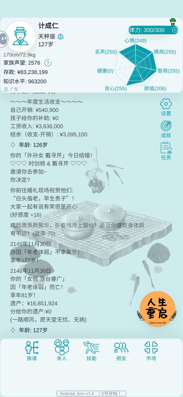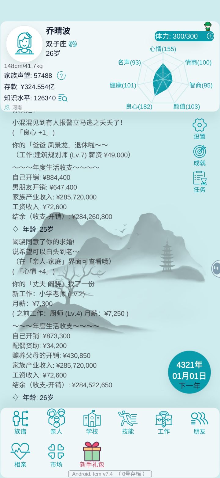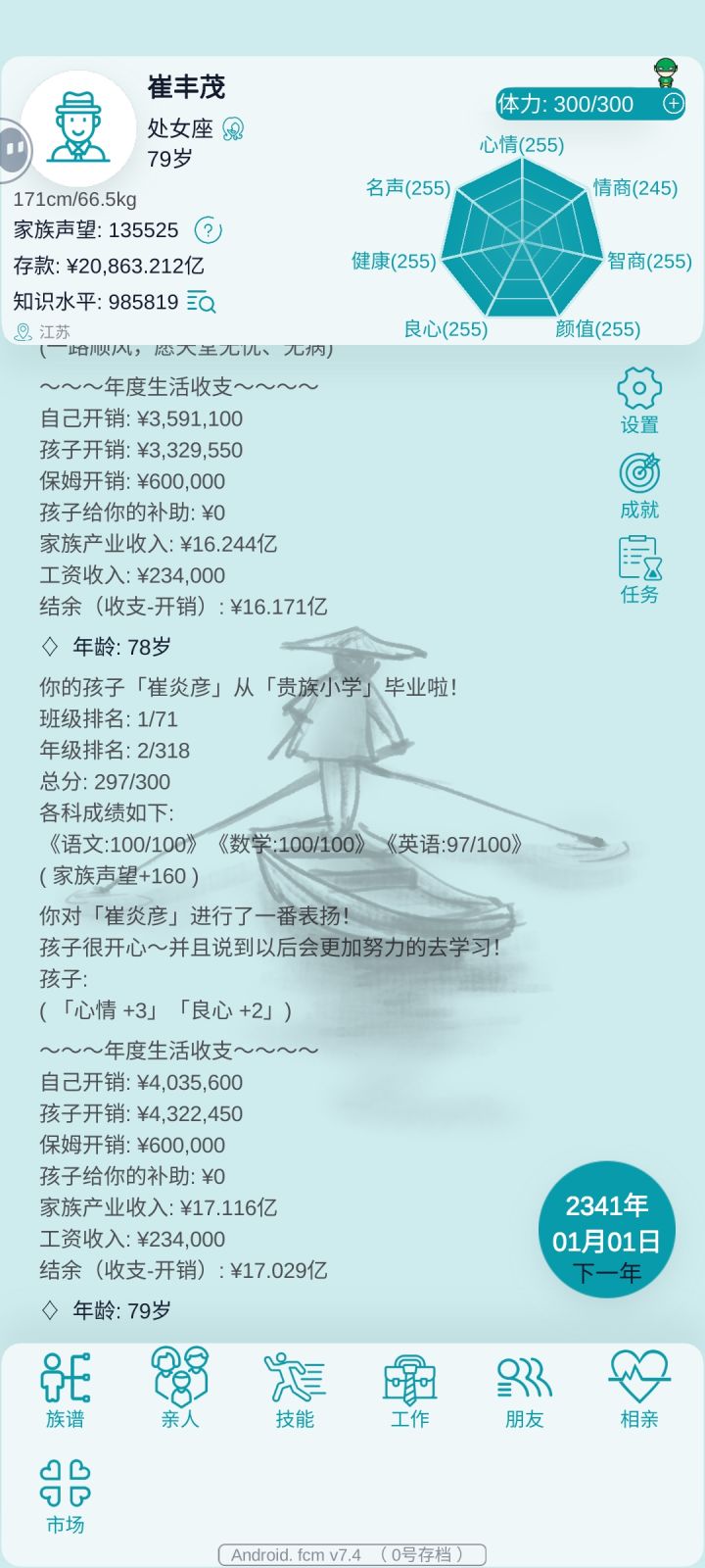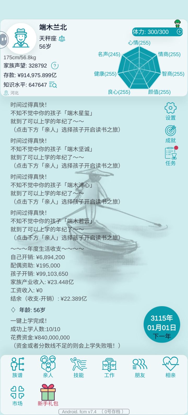 第一次玩,选错了很多东西。技能的话如果你有天赋,或者没有也行,最好选择一个,底下的技能都很好。我原本是有成为摸金的天赋的,可惜我不知道是啥,最后勉勉强强弄上了潜水。离了个大谱,我潜水干到了110多岁还在上班。技能和职业都满级了,一年303万。买了股份忘记看了,哈哈哈。宠物好鸡肋,那个摇骰子不会玩辛辛苦苦攒钱,最后还是没能够买下最便宜的企业,差一点点我就嗝屁了……父母都一一离去