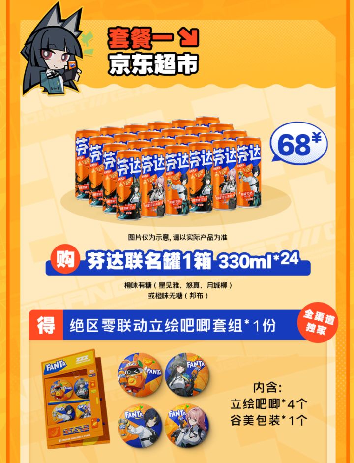 开售时间如图~联动周边:立绘吧唧、芬达罐透卡、亚克力立牌套组、镭射票、亚克力卡套餐一:京东超市需购:芬达联名罐1箱-330ml*24(¥68)领取:联动立绘吧唧套组*1份套餐二:天猫超市需购:芬达联名罐1箱-330ml*24(¥68)领取:联动芬达罐透卡套组*1份套餐三:京东超市、天猫超市需购:芬达联名罐2箱-330ml*24*2(¥145)领取:联动亚克力立牌套组*1份套餐