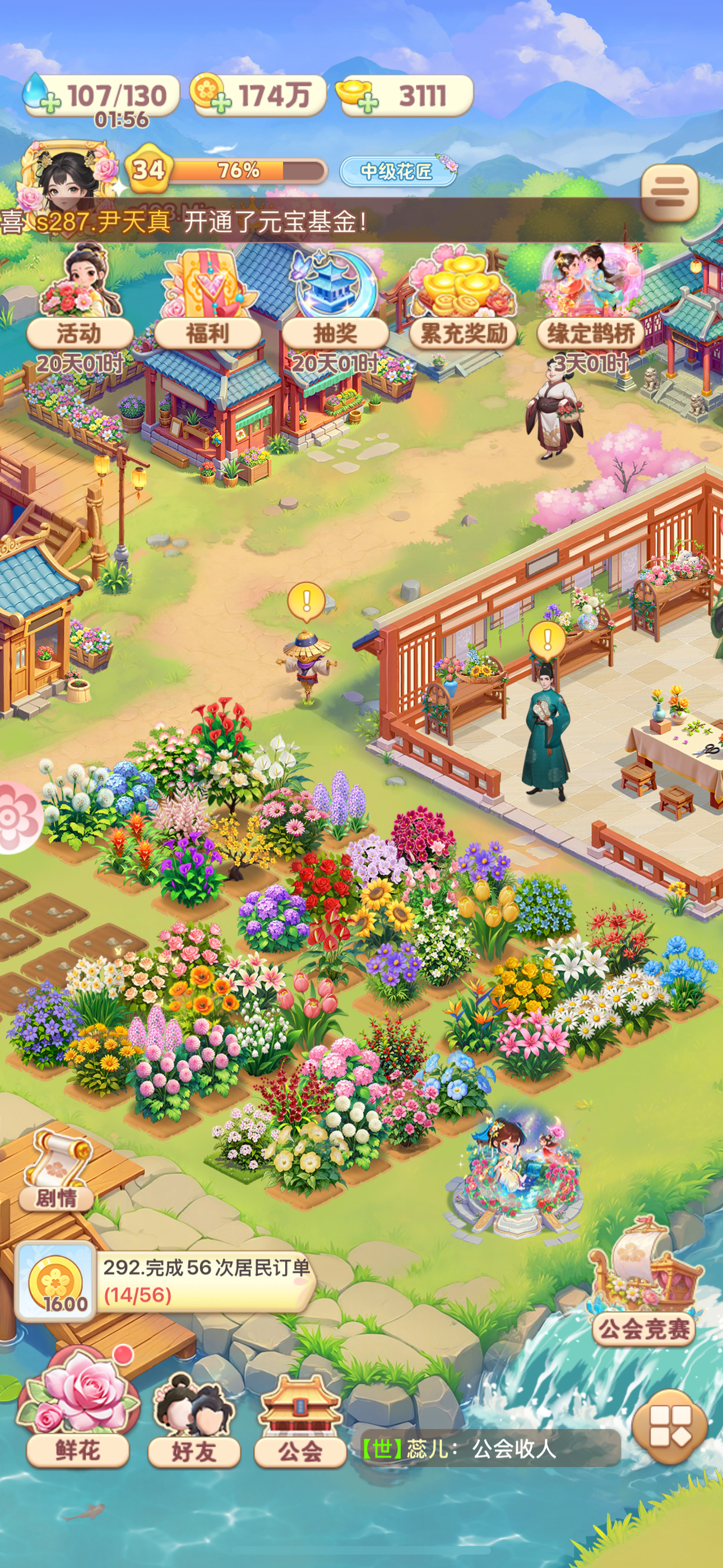 重要提醒: 记得看广告开双倍! 不要急着领花坊的任何花瓶! 好友加满,常看常偷! 公会记得种花收花!(我是种耗时最长的,分享最贵的) 公会币不要升级种植!去公会商店每天换需要的材料! 零氪不要过快升级!升得越快,培养花的材料需要消耗的元宝就会越多!所以需要控经验!多去材料商店买材料! 花架上架:一直做最高价的卖!记得在双倍时间领取或下架! 居民订单(订单板):控等级的每天只做60个绸缎订单拿宝箱奖