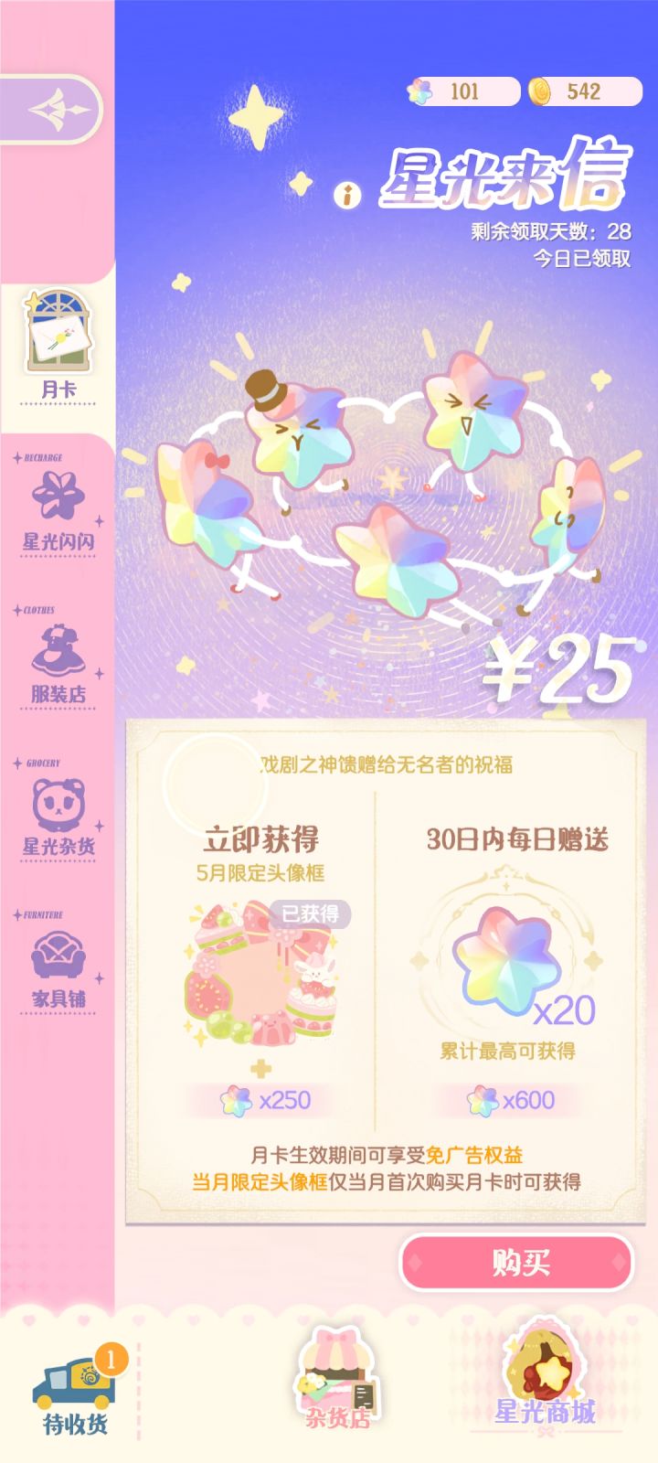 小编得知季节衣服限定之后非常痛心,于是马不停蹄地计算了不同党的星光币获取情况,以及一个季节不同党到底能拿下几套衣服(如果不算活动奖励及补偿的话),希望这篇对主理人们能有帮助👉👉👉不同党拿下季节限定衣服结果指路最后🌟0氪篇(按月算)广告费 10*30=300(每天看广告都有10星光币)每日分享 1*30=30(每日分享可得一个星光币)300+30=