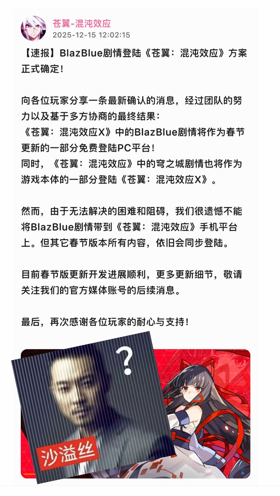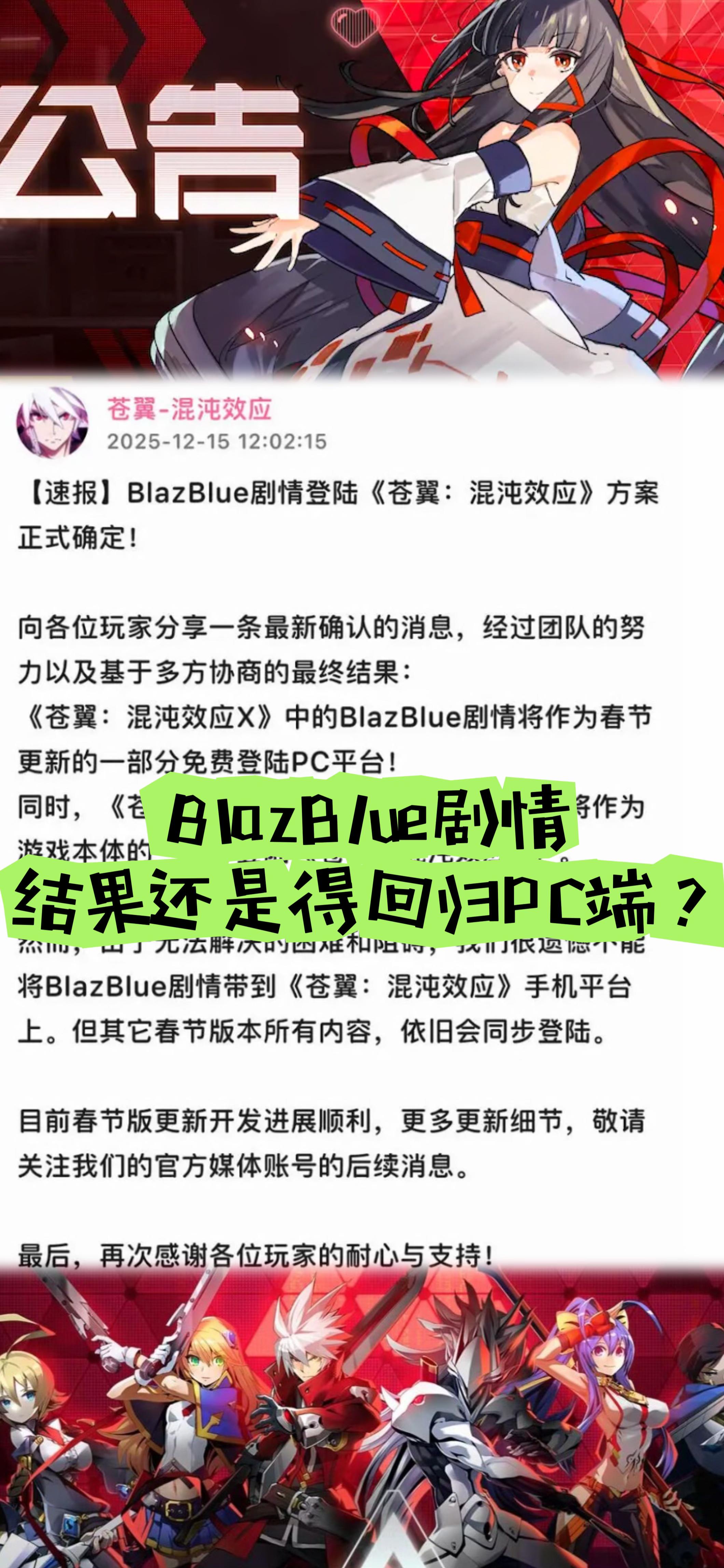 由于无法解决的困难和阻碍,我们很遗憾不能将BlazBlue剧情带到《苍翼:混沌效应》手机平台上。但其它春节版本所有内容,依旧会同步登陆。