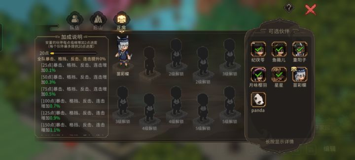 如何补救苗彩蝶与妙音坊(二)(开家园或不开,都可以)上回说到接取剿灭任务和完成方法,完成剿灭任务之后,如果已经完成冰牢任务且妙音坊主好感大于80可触发子夜不老泉双休任务(结缘任务),和降服三教任务(解锁特性任务)和咱们坊主双休五天之后坊主可入队,但在入队前,先接取降服三教任务。坊主入队就结缘,然后我们把鱼薇儿好感拉满,这个时候再邀请,会有特殊对话,坊主同意她入队,顾倾城的话,把群芳阁任务做了之