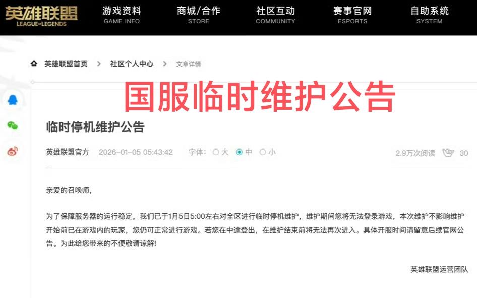 2026年1月5日凌晨5点,《英雄联盟》国服及全球多服务器突发临时停机维护,腾讯游戏客服回应相关疑问并辟谣网传百年证书续期的不实消息。此次维护影响范围覆盖国服、美服、欧服、韩服等全球服务器,维护期间玩家无法登录游戏,已在游戏内的玩家可继续完成对战,但中途登出后无法重新进入。维护初期有部分玩家反馈出现闪退、断线现象,曾有临时修改系统时间登录的尝试,拳头游戏为集中修复问题暂时关闭了排位队列。国服已于