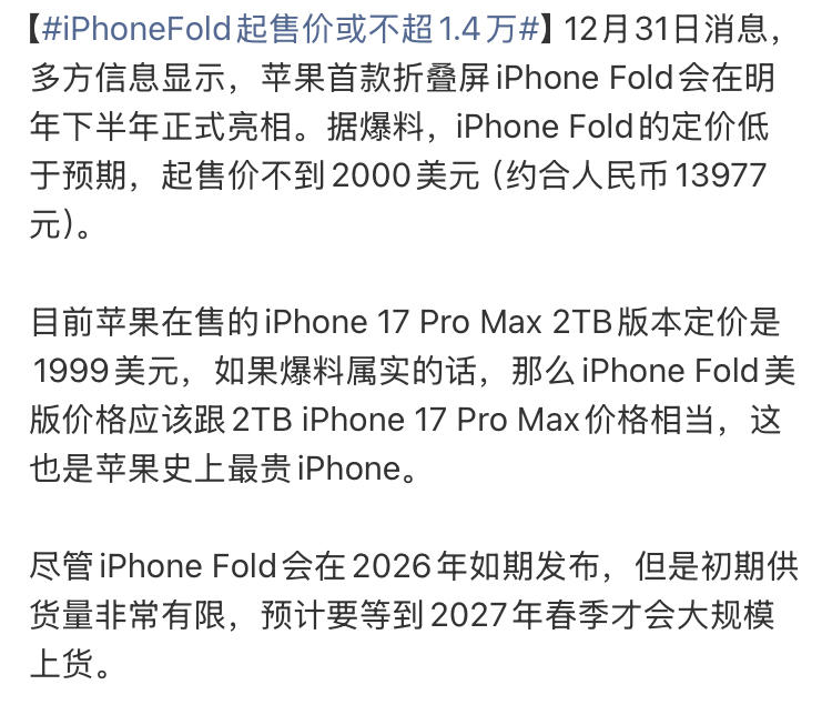 苹果的折叠屏终于来了,根据爆料是低于14000的,对于苹果来说还是第一个折叠屏真不贵了,但是估计明年会非常难买,只能说真的期待了太久了,要是能够原价买到就很好了,但是估计要后年才能轻易买到了。 #生活杂谈 #数码科技 #苹果手机