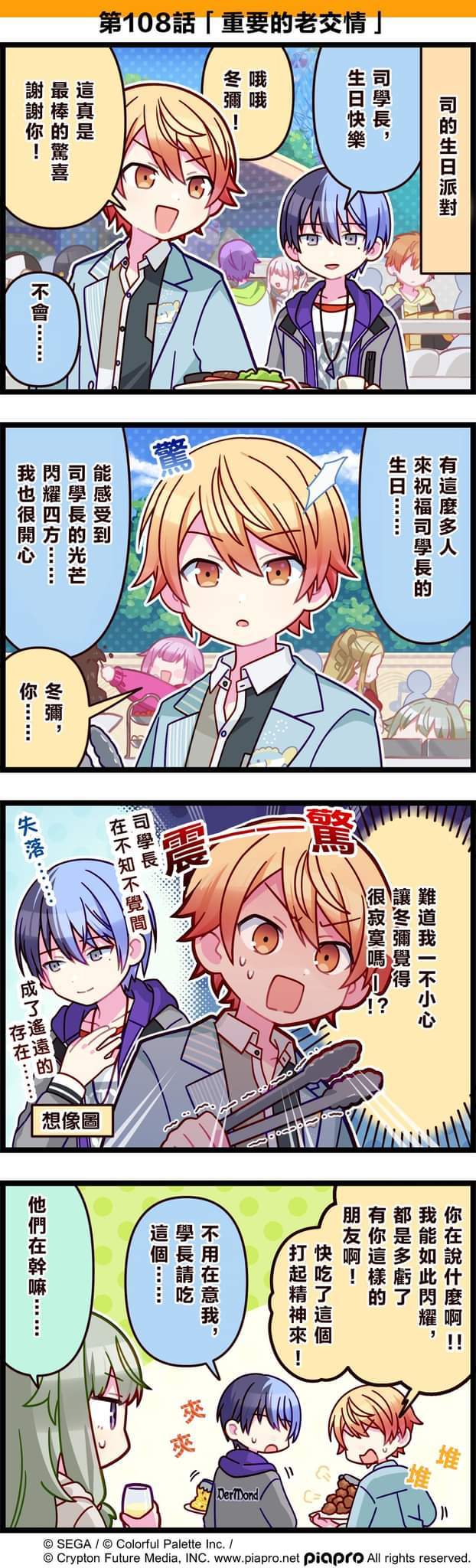 【「世界」劇場 四格漫畫】 尊敬的各位居民:今天5/17是Wonderlands×Showtime成員「天馬司」的生日!🍰來看看關於天馬司與青柳冬彌的小故事吧~第108話「重要的老交情]🍽️#pjsk #世界计划 #天马司 #草莓宁宁 #青柳冬弥
