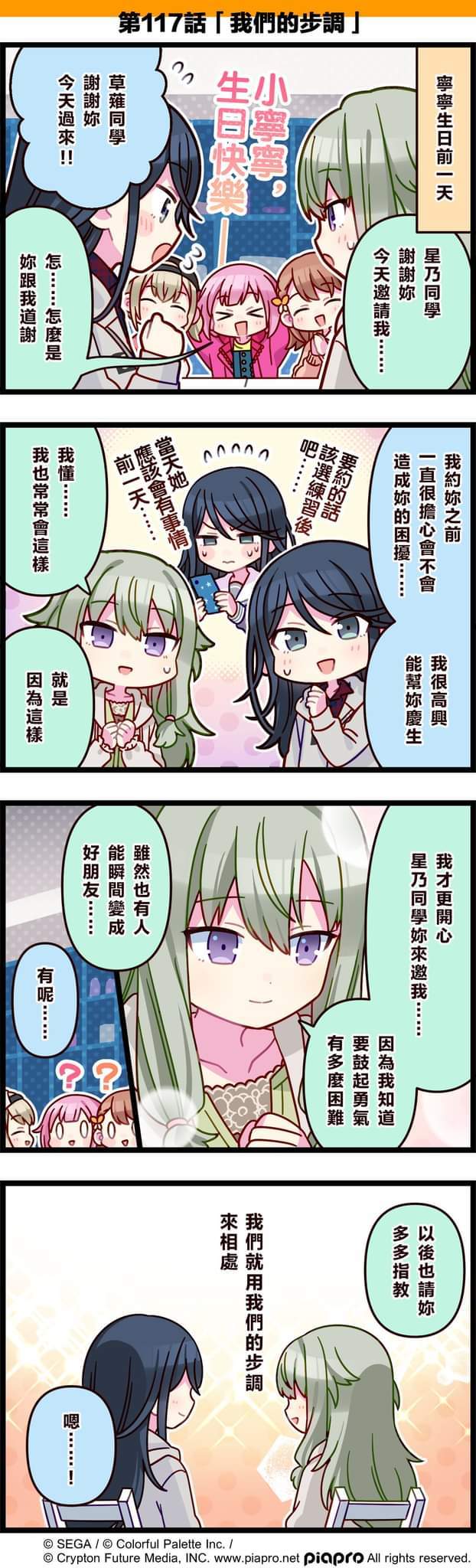【「世界」劇場 四格漫畫】 尊敬的各位居民: 今天7/20是 Wonderlands×Showtime成員「草薙寧寧」的生日!🍰 來看看關於草薙寧寧和星乃一歌的小故事吧~ 第117話「我們的步調」🎉 #pjsk #世界计划 #草莓宁宁 #小豆泽心羽 #凤笑萝 #花里實乃理 #星乃一歌