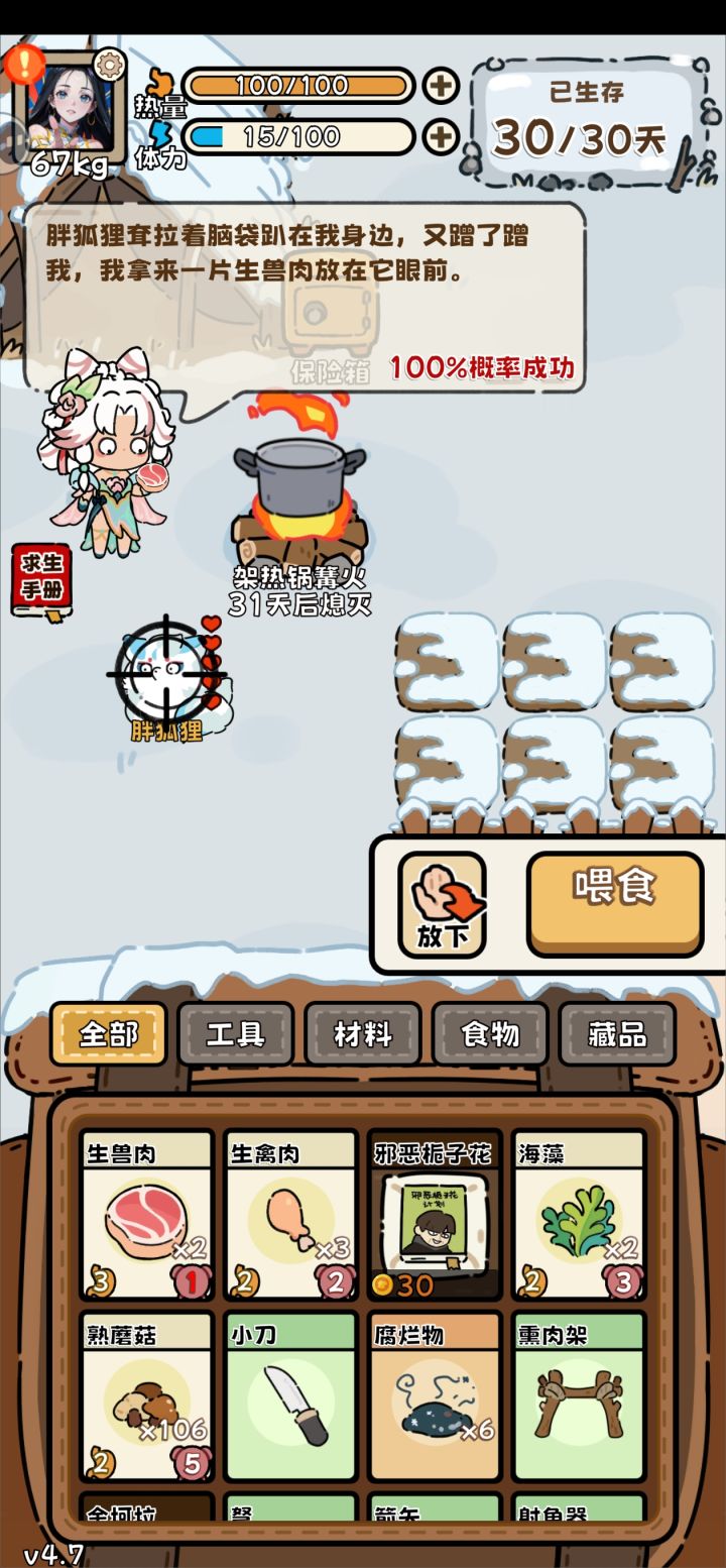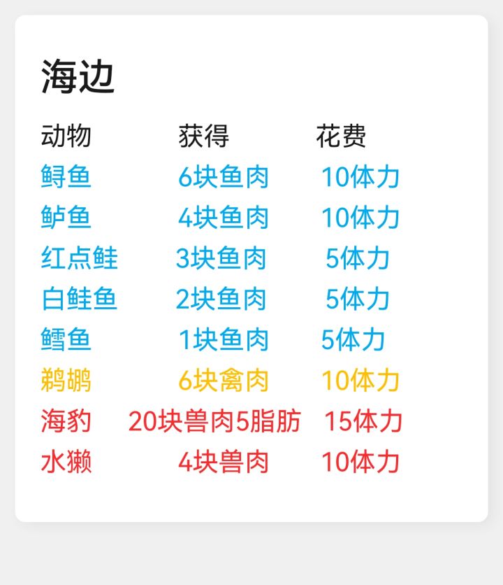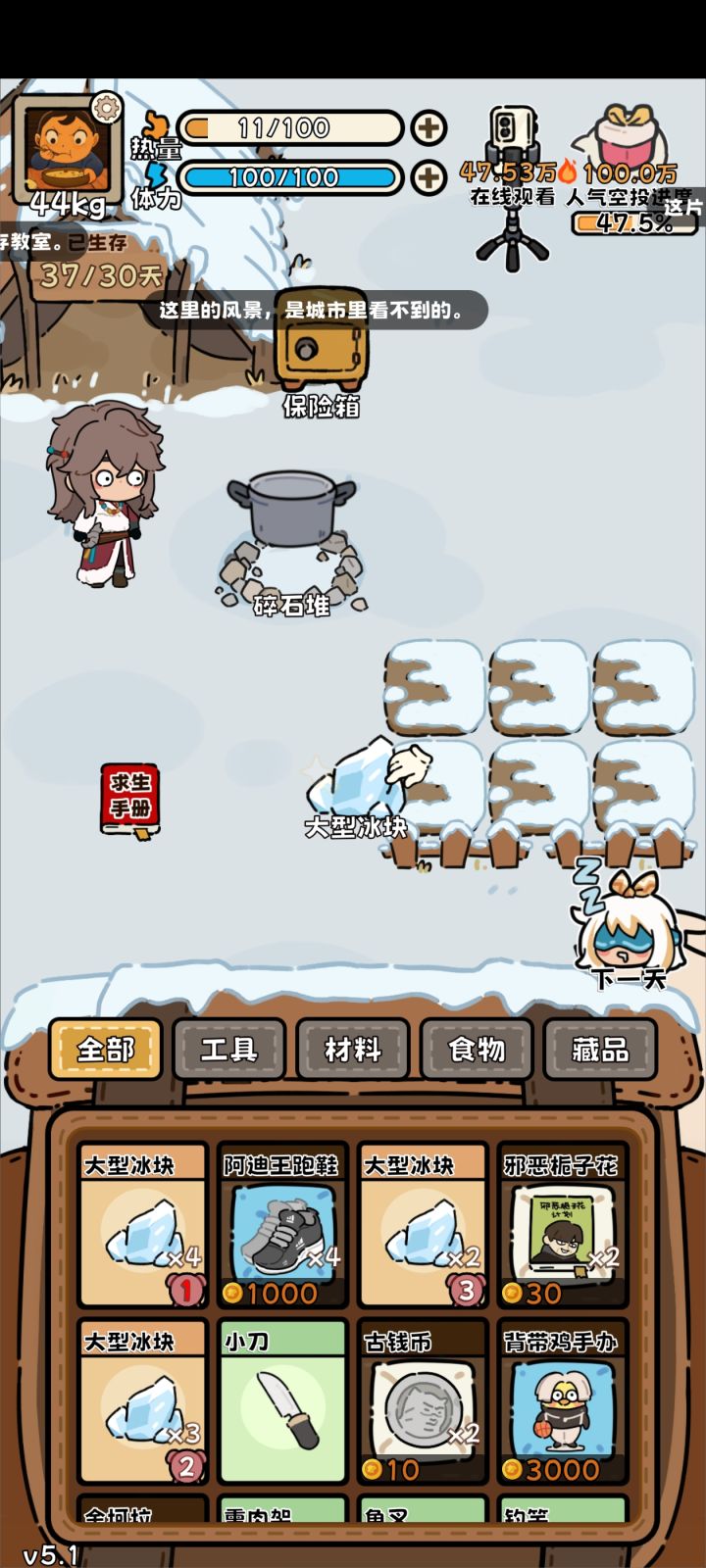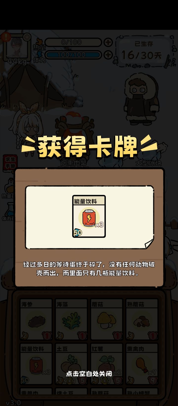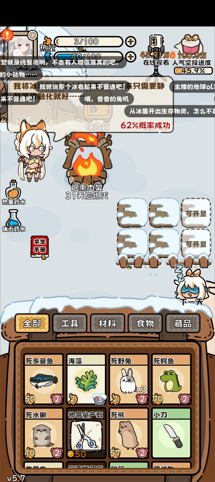 通用空投:羽绒服(热量消耗降低,约平时20冬天30➕)、幸运药水(提升成功率和命中)、能量饮料(2×50体,前期)通用路径:①苟:前期食物丰富时菜肉都拖到最后再做,烂前吃。遇熊/豹开熏肉。脂肪消耗约0.5热量差②v3.5熟鱼肉➕1,开局躺椅后走钓鱼更容易通关了③广告价值:27天左右热量广告(普通可续命2天➕,羽绒服可续命3天➕)>1天能量广告>熊豹时能量广告>其他④未成形:熊豹>>砍树>