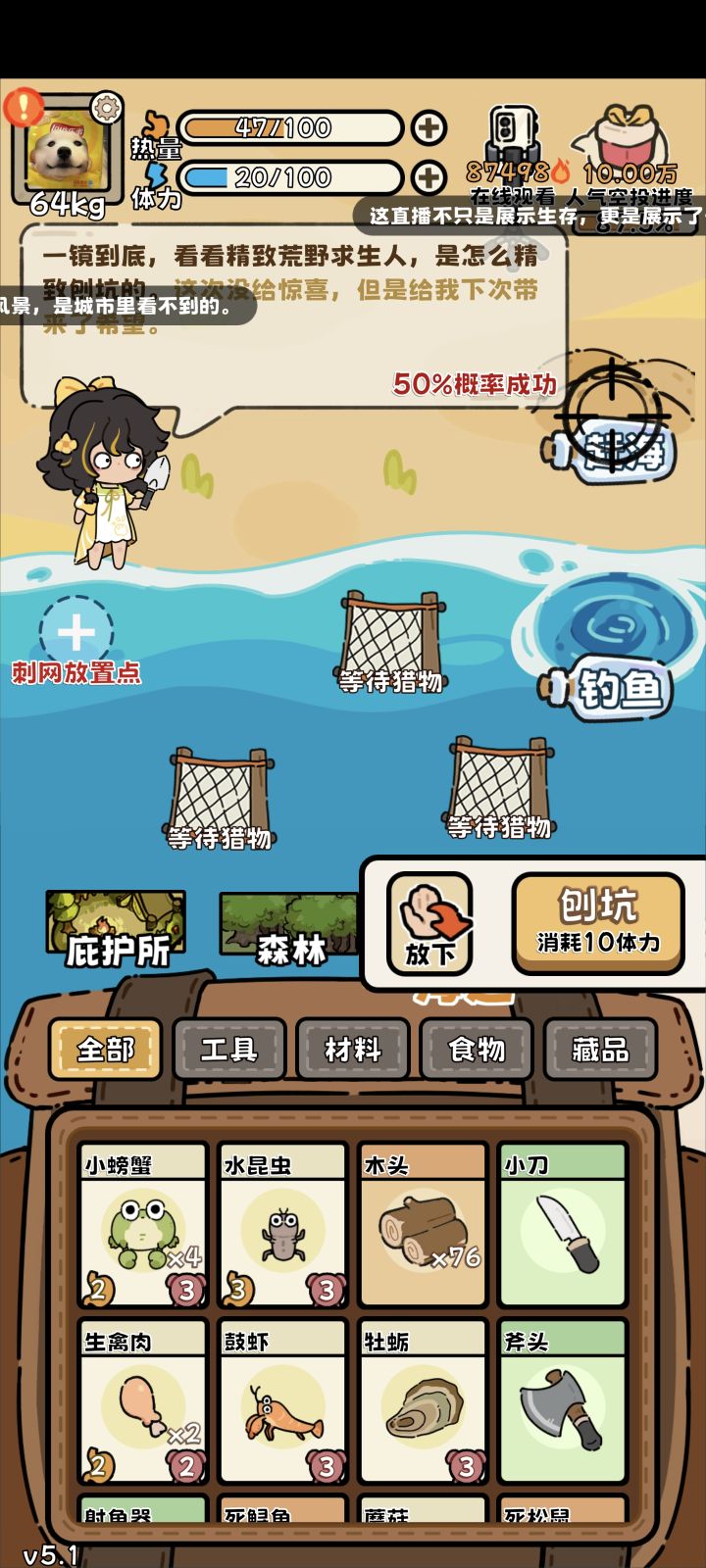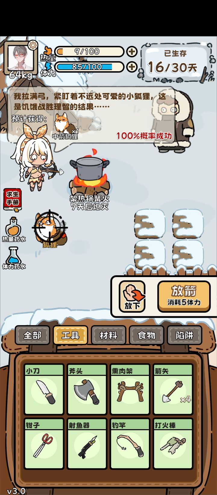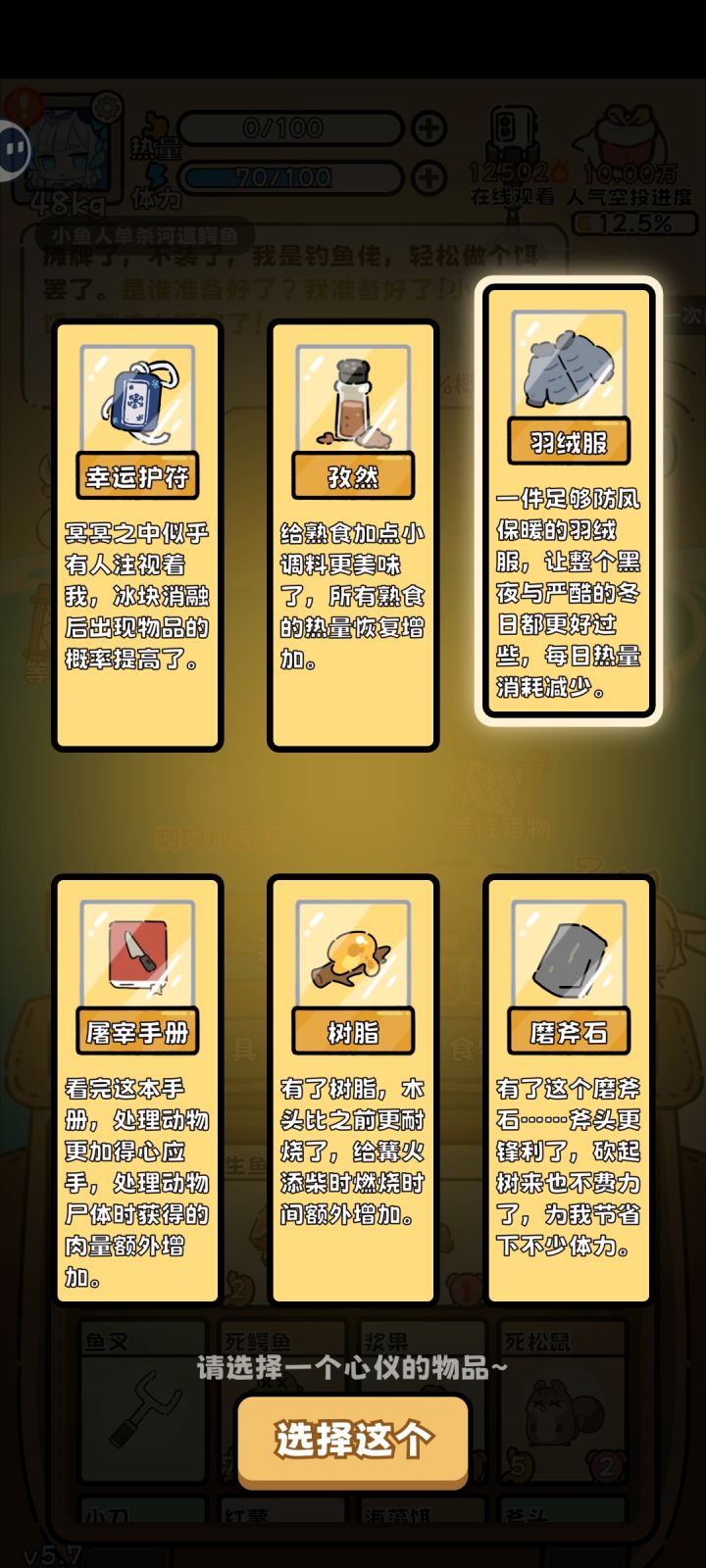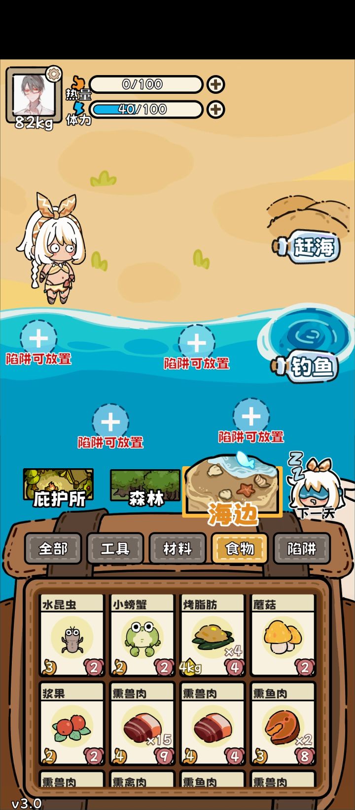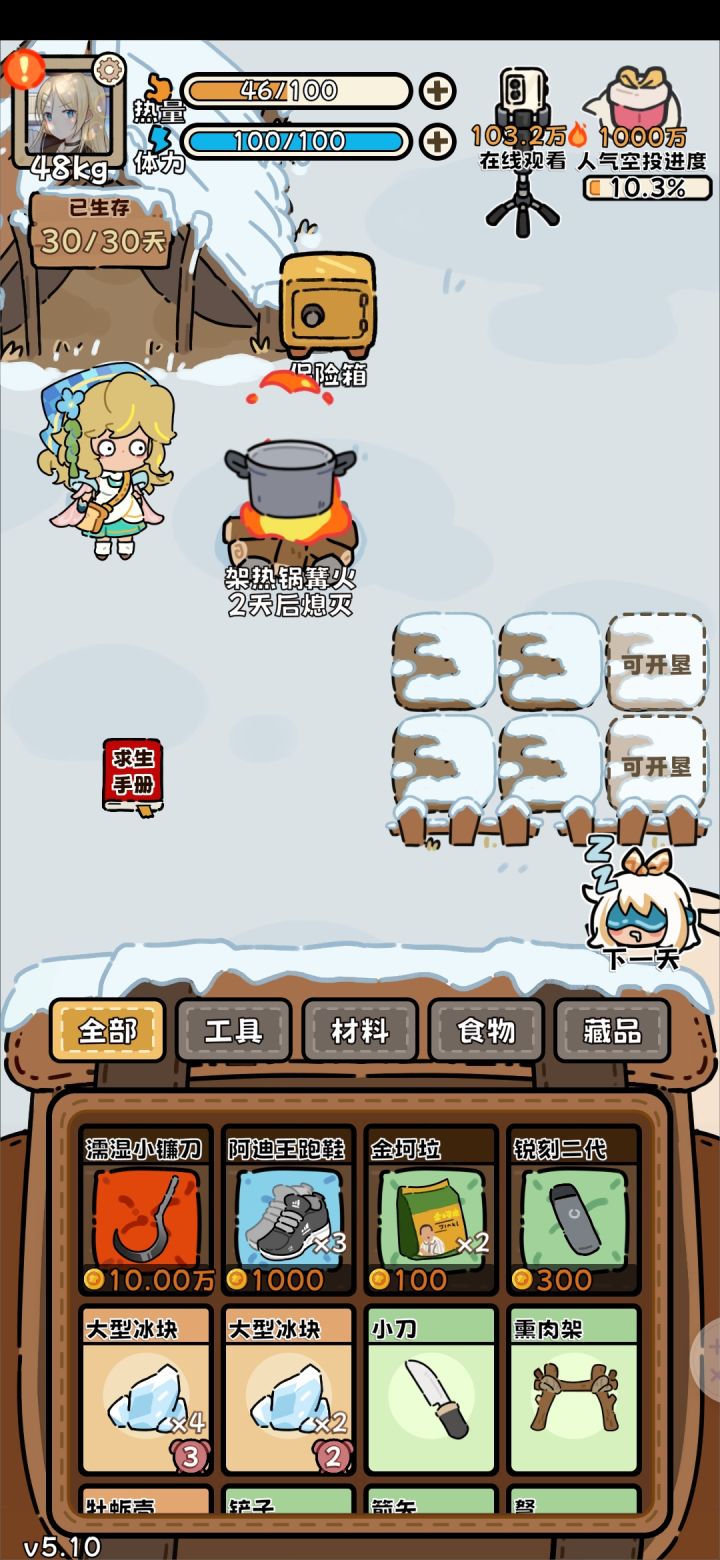 通用空投:羽绒服(热量消耗降低,约平时20冬天30➕)、幸运药水(提升成功率和命中)、能量饮料(2×50体,前期)通用路径:①苟:前期食物丰富时菜肉都拖到最后再做,烂前吃。遇熊/豹开熏肉。脂肪消耗约0.5热量差②v3.5熟鱼肉➕1,开局躺椅后走钓鱼更容易通关了③广告价值:27天左右热量广告(普通可续命2天➕,羽绒服可续命3天➕)>1天能量广告>熊豹时能量广告>其他④未成形:熊豹>>砍树>