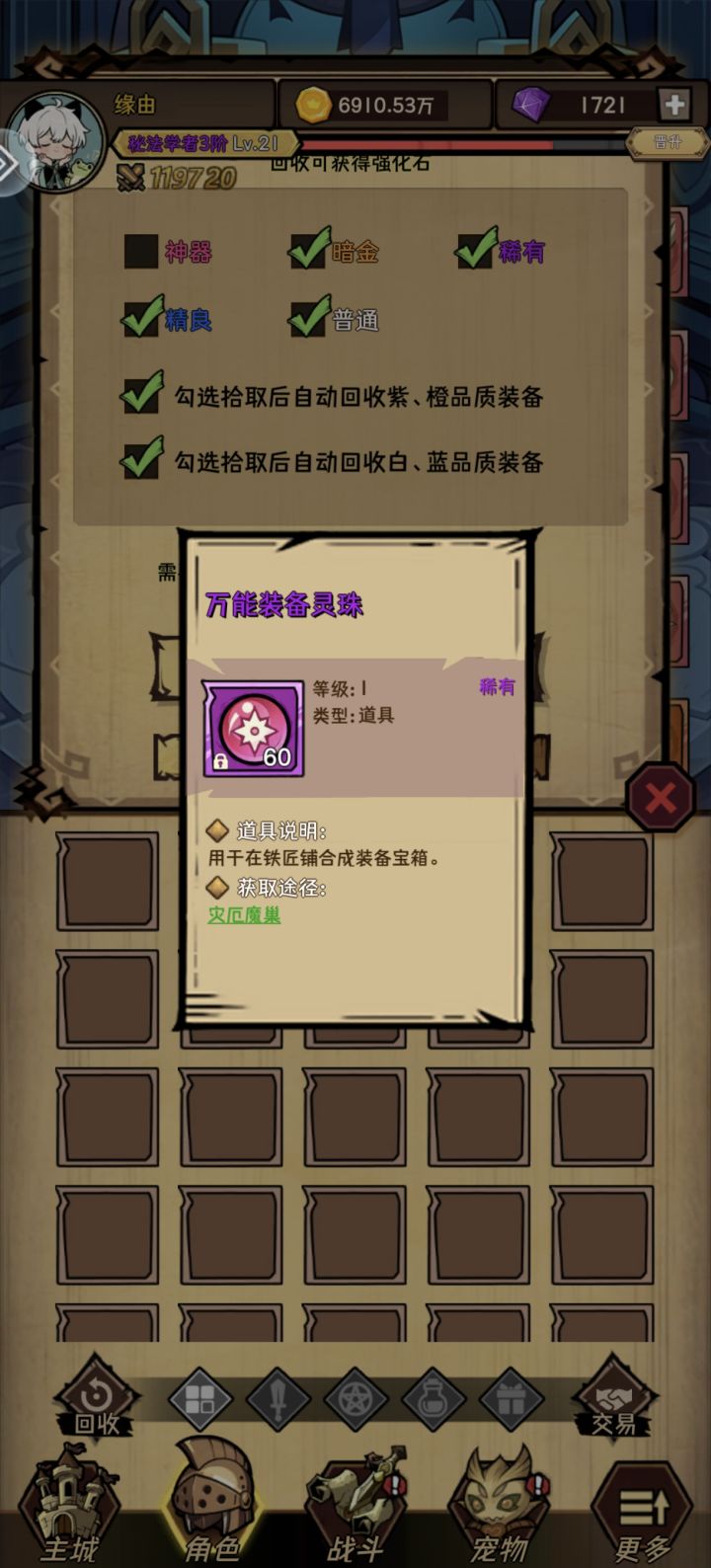 装备万能灵猪是回收别的装备获得。如图中,铁匠铺→合成→礼盒#荣耀冒险王 #荣耀冒险王攻略