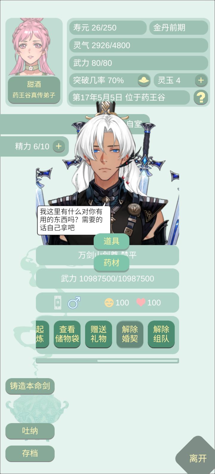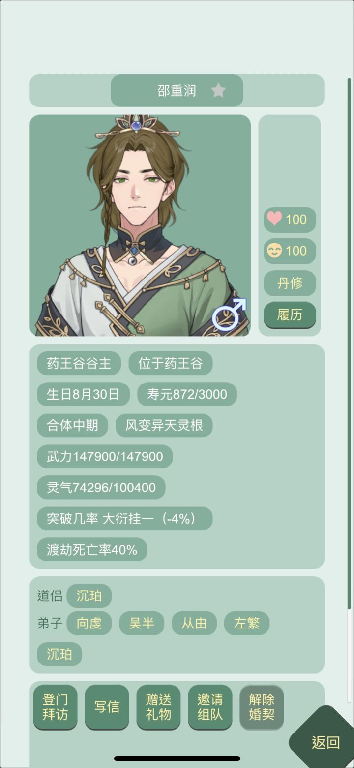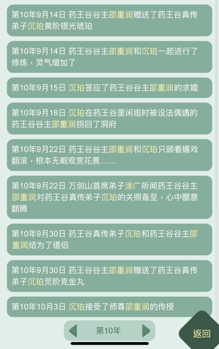 还是我有主见,10岁就看上了师尊,12岁拜入门下,18岁开始攻略,20岁就拐回家啦~第一次玩忍住没看攻略,中途还在想,师尊会不会不能拐,有点后悔选错了师父,还好还好,师父也能拐回家!万岁🎉!(图三)中途师尊就挣扎了一次,就坚定的求婚了嘿嘿嘿~(图四)一些小日常~(图五)零元购真的很爽,但我不会掏空师尊的,毕竟我还需要他给我炼丹呢(图六)是第一次和师尊双休!啊啊啊谁懂这句话有