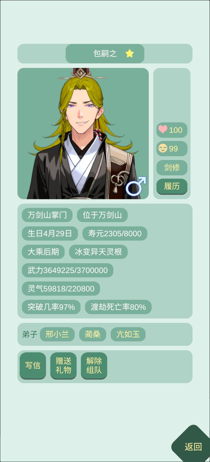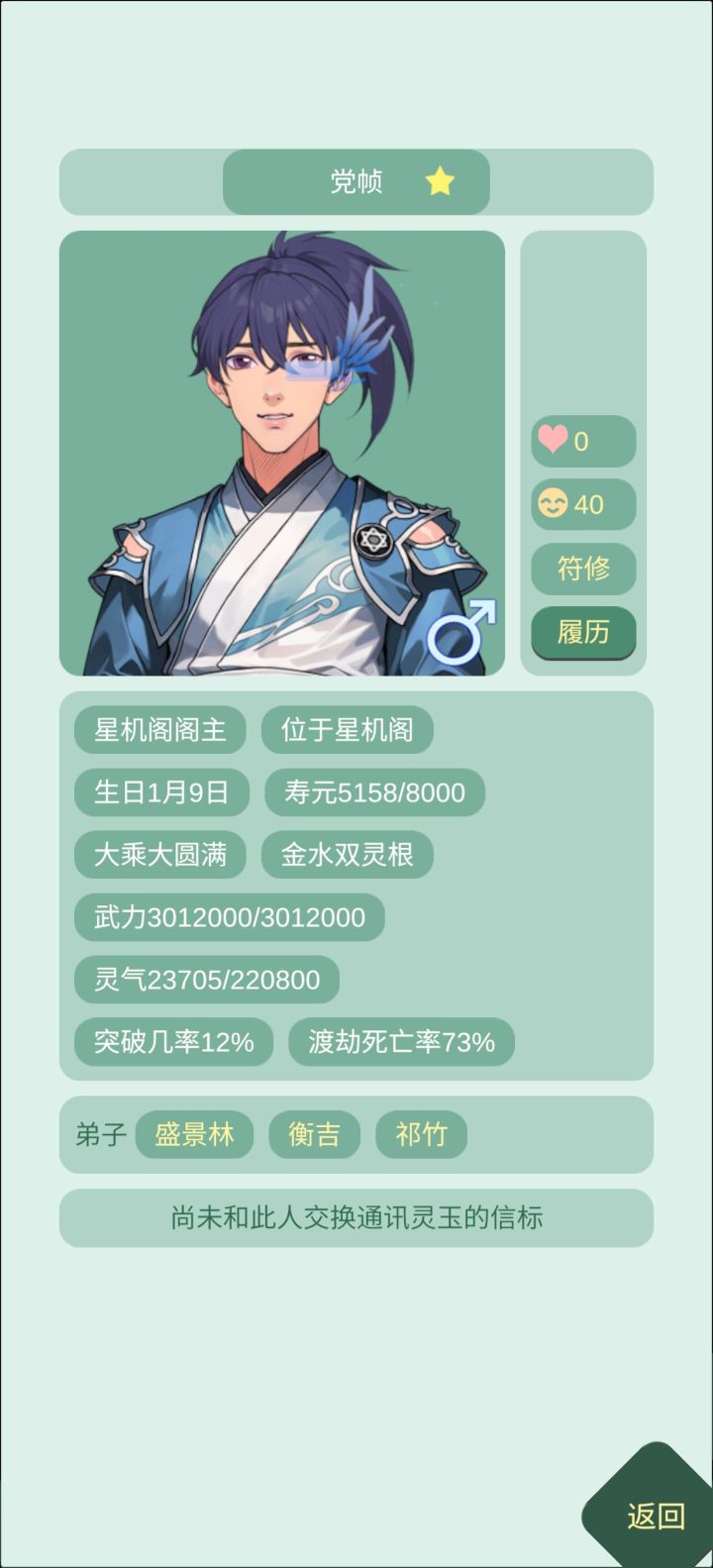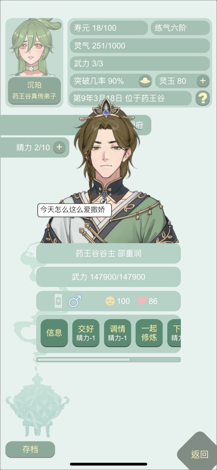 之前每次开新档,前期就算拜谷主为师,打怪还感觉不够强,时不时就要失败一下,特别对于前期没战力、药也不够多的我们很不友好,于是被我发现战力可以在开局sl的办法!首先先开新档,当第一个大弟子来领你进门的时候,点开他or她主页,查看师尊。一般这个弟子的师傅都是谷主,直接查看,如果感觉战力不够立刻重开。谷主战力高的好处→意味着万剑山掌门和剑尊的战力会更高(因为丹修同阶级战力—50%),开