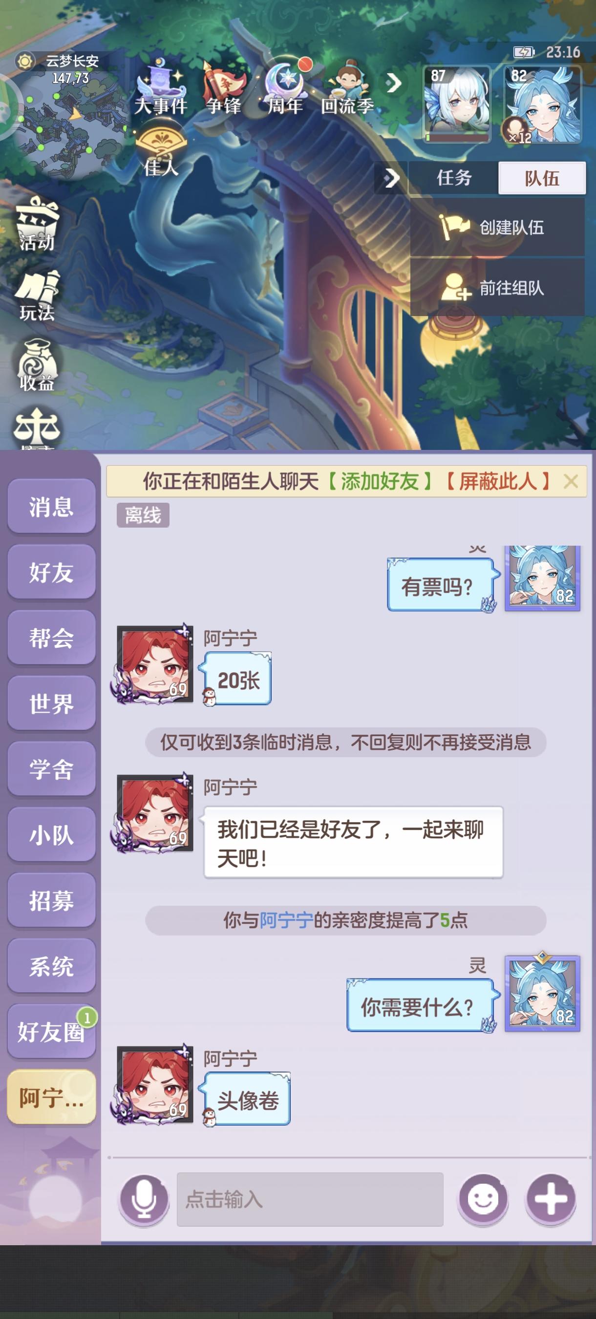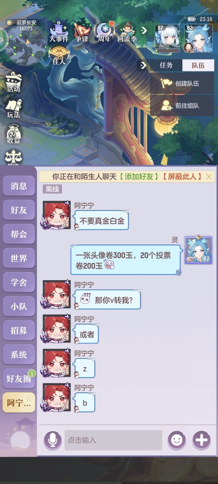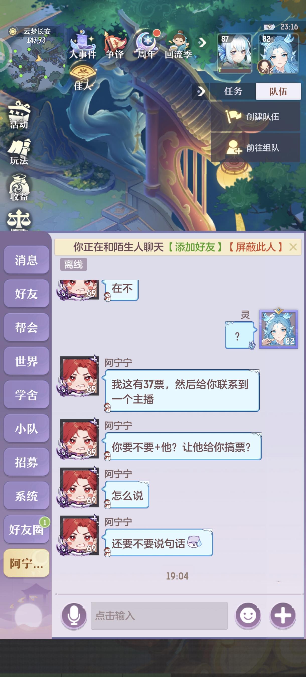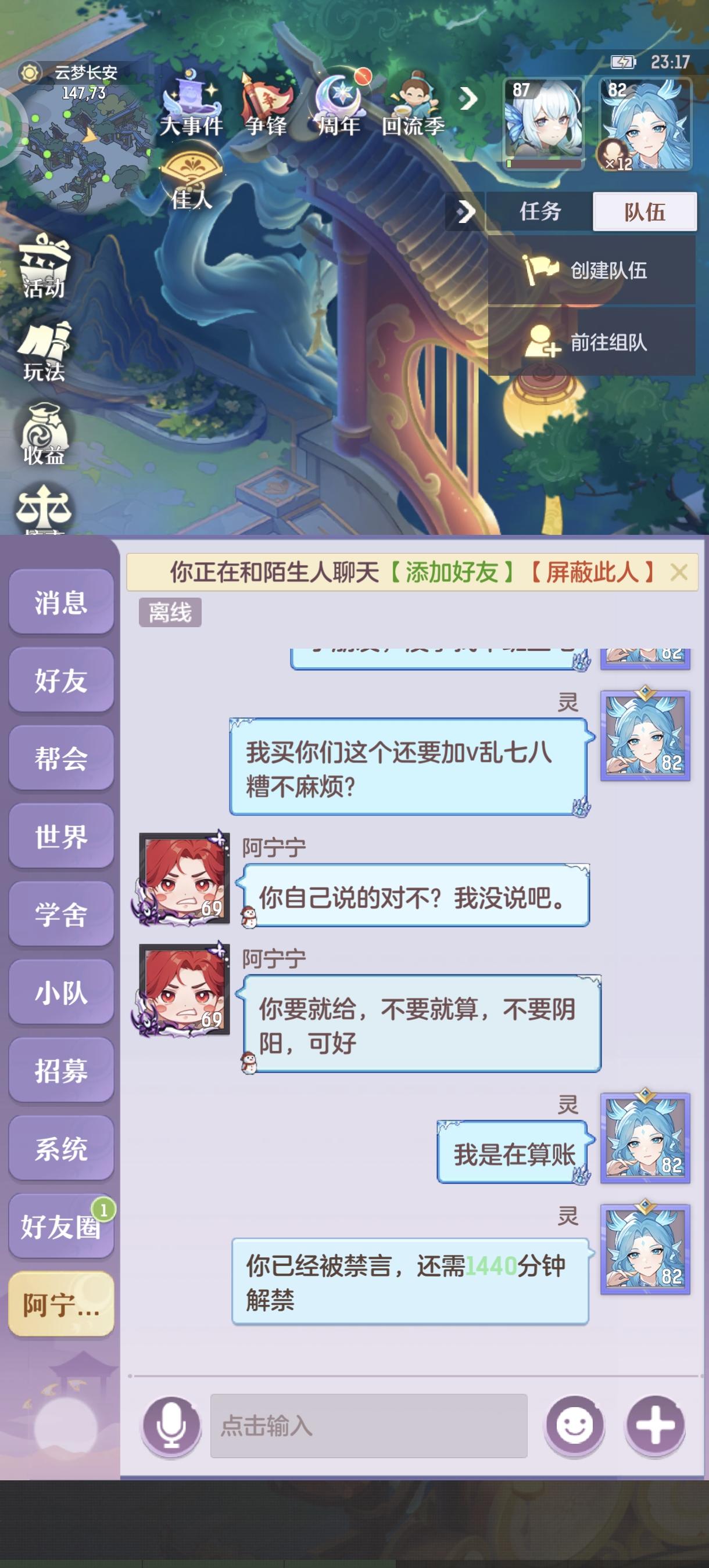 #莫名其妙的禁言 #游戏日常 #浅评一下 我想问一下官方,就这么的给我禁言了???这个人在世界说有票谁要,我就加好友问了一下,截图是所有聊天内容,然后我就给禁言了???禁言以后也不能带队发链接,有的任务也没办法让别人协助,佳人拉票活动也不能拉票,请问这个损失有人管??? (本来开始觉得24小时禁言了也没办法,但是后面我发现这个人把我好友删了以后,我才反应过来我是被这个人举报了,越想越郁闷,