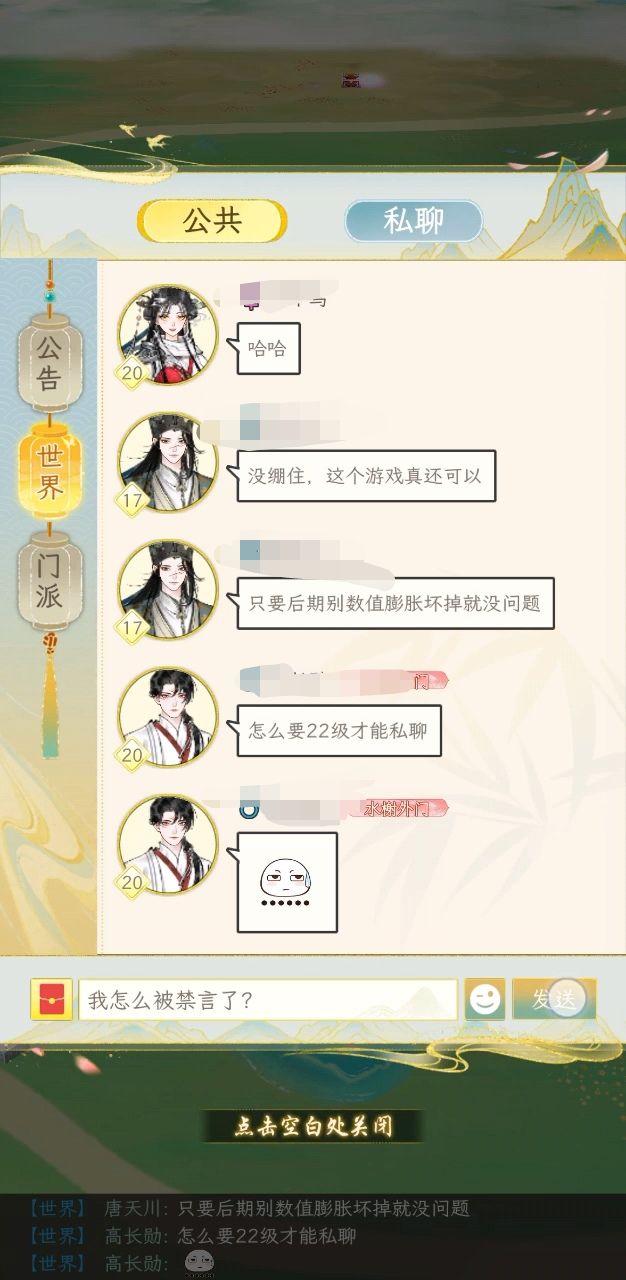 本来说话好好的突然不能说话了,打什么字点击发送都会消失发不出去,重登也是一样#华夏千秋 #bug反馈 #莫名其妙的禁言