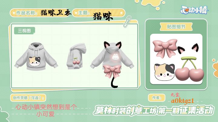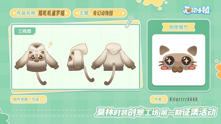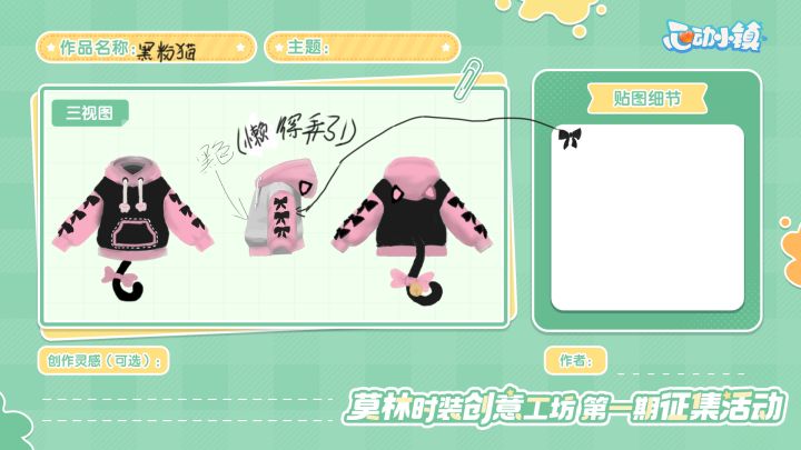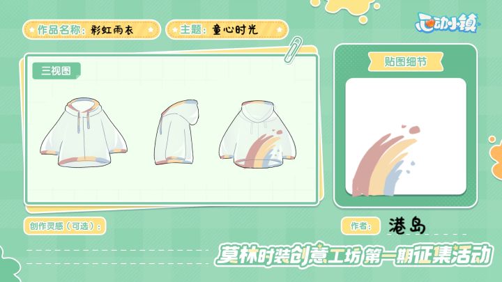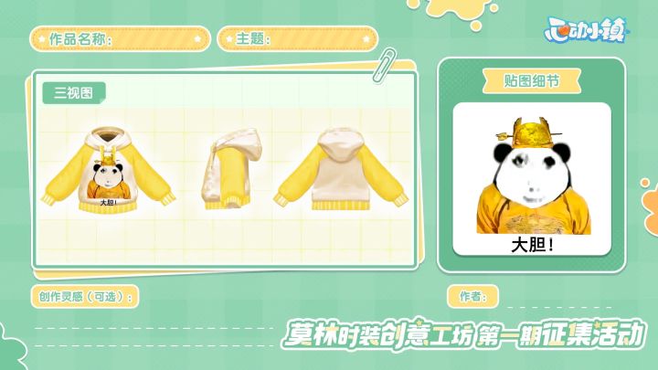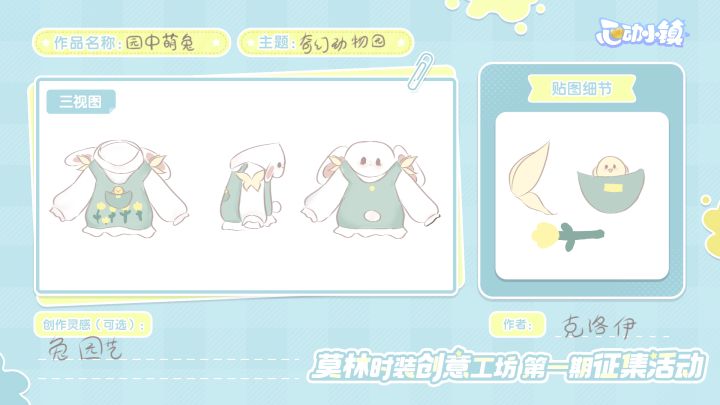 第一期莫林时装创意工坊的征集开启啦~小镇上的服装店,怎么能少得了发展家的设计呢?多萝西为发展家们准备了两套服装版型,欢迎发展家们发挥天马行空的想象力,为服装设计印花,最终被喵喵选中的前10热度作品,将会经过多萝西的制作,加入服装店哦!【活动周期】 1、投稿:8月30日至9月26日2、获奖统计:9月27日3、结果公示:10月3日至10月10日4、活动奖励发放:10月24日前5、获奖服