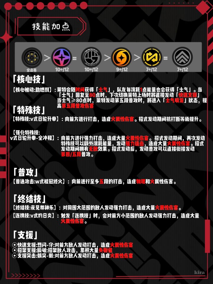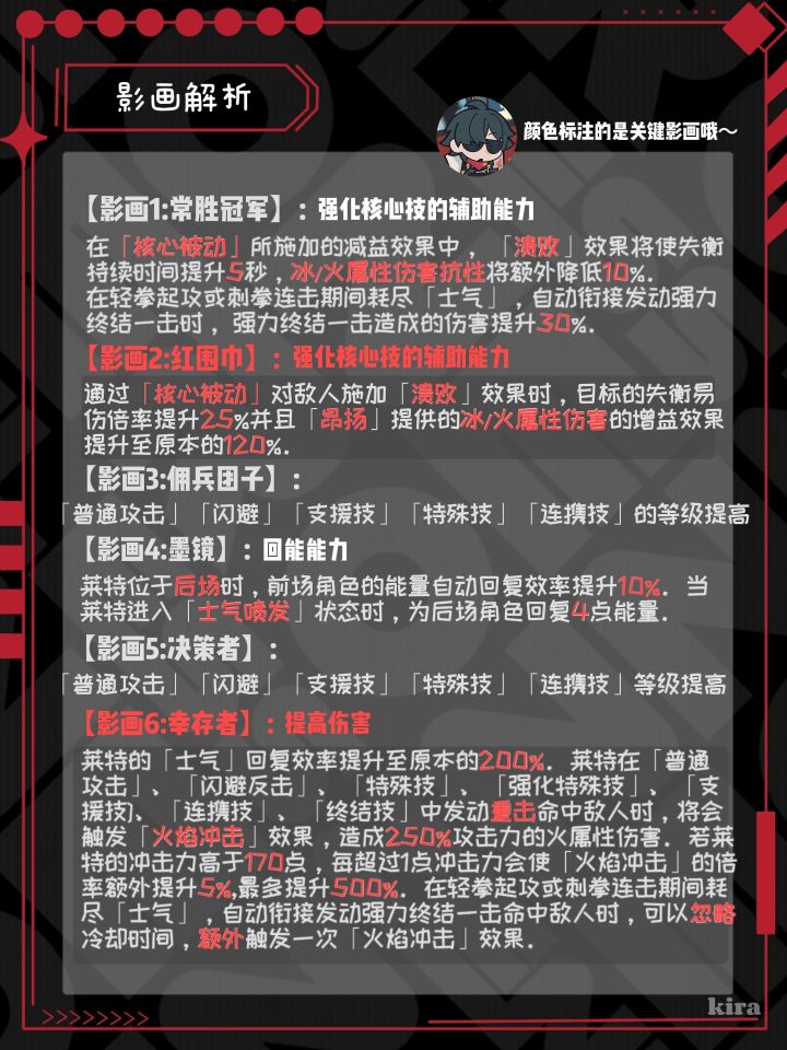 UID:19966145各位绳匠们好呀!!今天带来的是莱特的攻略!!本期也是分为6个模块哦!由于字数限制,具体详情请绳匠们看图片哦~文字版就简略啦ε(*・ω・)_/゚:・☆▌角色养成如图所示的材料,是升满等级和技能的材料哦!▌技能加点核心技>特殊技=普攻>终结技>支援=闪避▌影画解析关键影画:影画2,影画6【影画1:常胜冠军】:强化核心技的辅助能力【影画2:红围巾】:强化核心技的