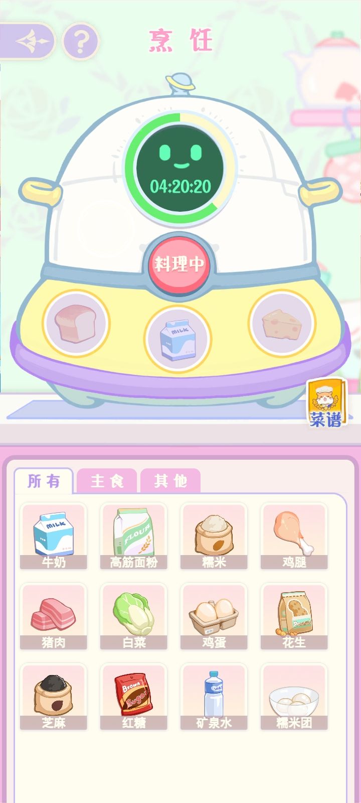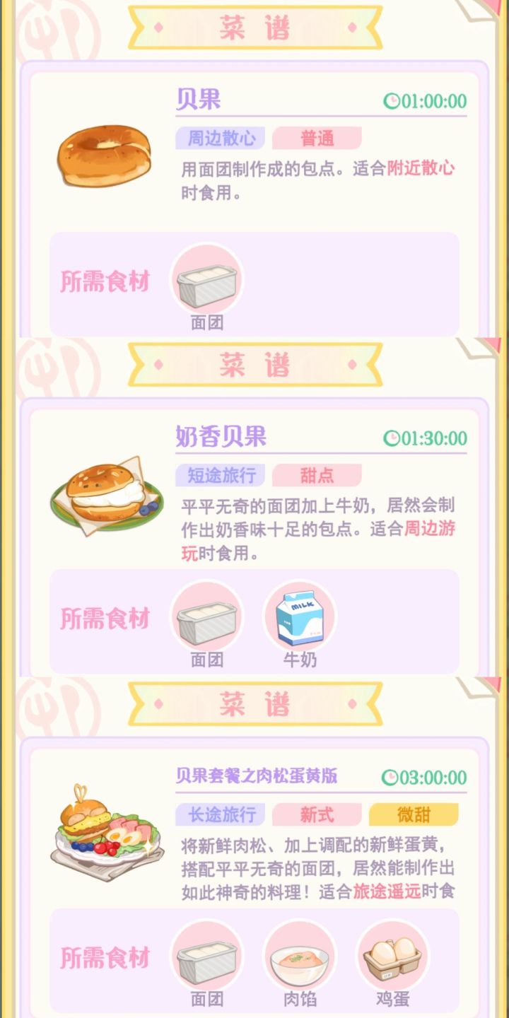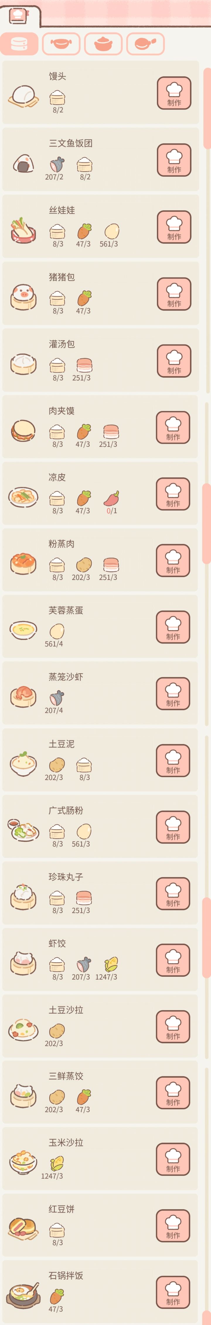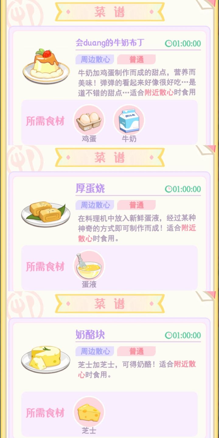 目前收录的菜谱大概分 5类——图1:半成品,5个。图2:面包类,5个。图3:肉类,4个。图4:鸡蛋 or 牛奶类,3个。图5:面团类,3个。(ps:只需单一食材的食谱可对第二份食材做替换,比如鸡腿+鸡腿/鸡蛋/牛奶都可八秒出肉馅;糯米+糯米/高筋面粉都可八秒出糯米团……)版本更新后的出的菜谱见图6、7。文字记录——糯米团+花生/芝麻=花生/芝麻汤圆糯米团+糯米团=日式丸子糯米