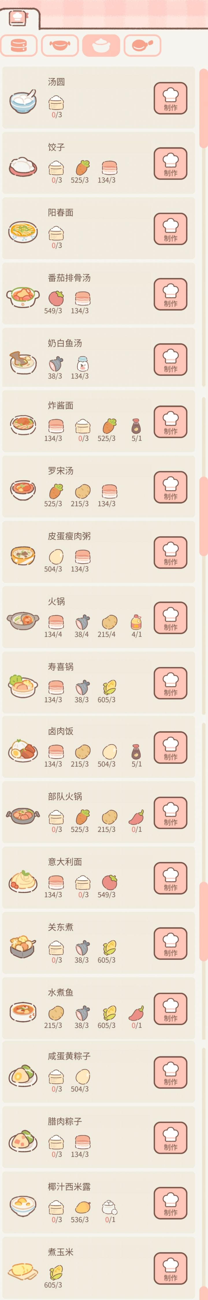 1、大乱炖:①辣椒、南瓜、白菜,②辣椒、大豆、茄子2、麻辣烫:①辣椒、南瓜、白菜,②辣椒、大豆、茄子3、桃花酿:①小麦、蟠桃、甘蔗,②小麦、蟠桃、西瓜4、清补凉:①小麦、蟠桃、甘蔗,②小麦、蟠桃、西瓜5、相思卷:①草莓、大豆、甘蔗,②草莓、大豆、小麦6、白玉豆糕:①草莓、大豆、甘蔗,②草莓、大豆、小麦7、砂锅菜:①白菜、茄子、辣椒,②白菜、茄子、南瓜8、蔬菜鲜羹:①白菜、茄子、辣椒,