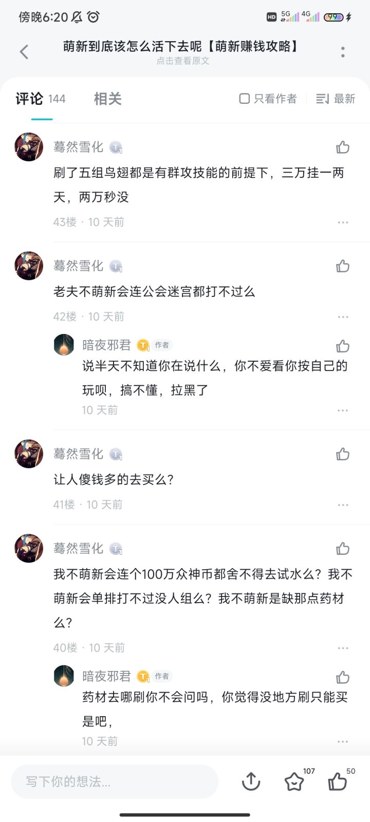爷新id:粉红色喵喵拳鸭 说简单点呢,就是很常见的爷新,之前在工会群里问了些问题,然后我们看了眼他的角色加点,完美的六边形加点,然后我们告诉他,让他去洗掉(后面看见等级直接让他删了重练),结果他觉得我们是在骗他删角色,后面也没说自己听懂了,然后他就转话题了,后面我师傅(转国际)脾气爆了点,语气就开始带点骂了,聊天截图没了,因为太久了,基本上就是他觉得我们在骗他,然后我刚进群看一眼还想好好给他解释