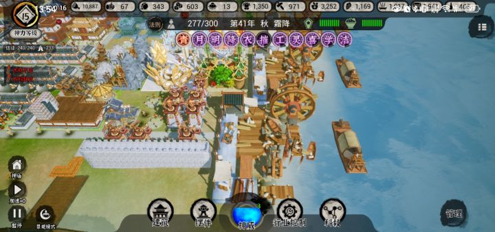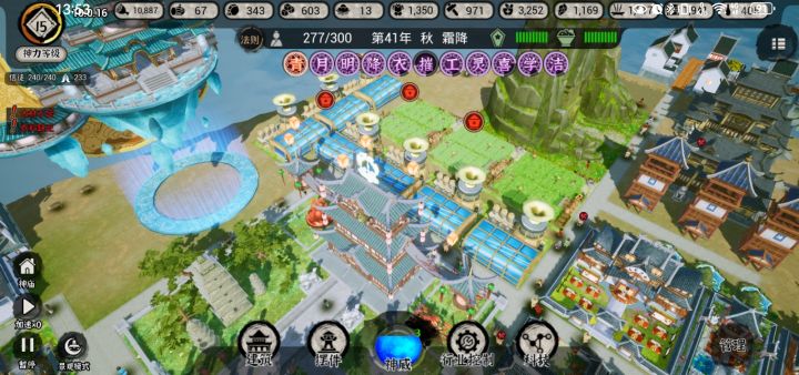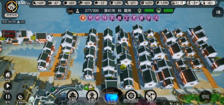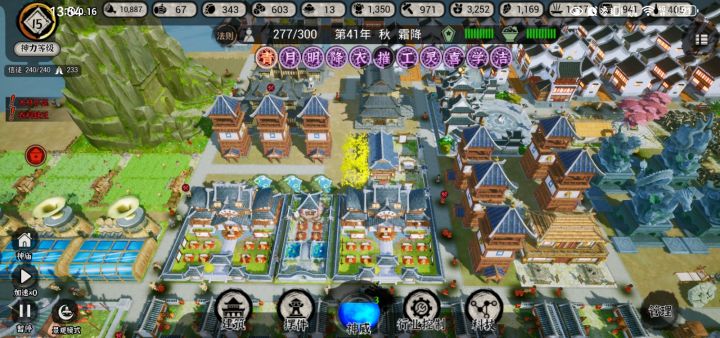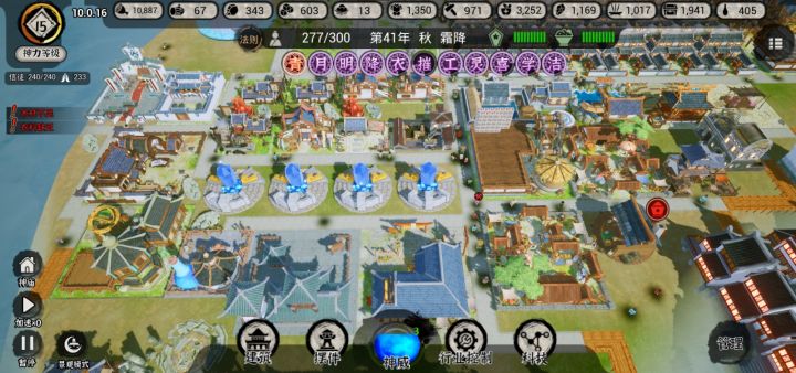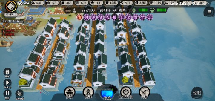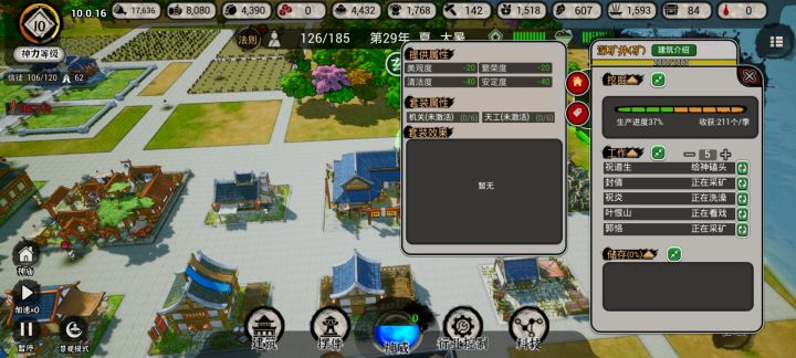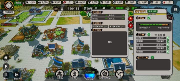 因为担心地图大了太复杂,就选了小地图,结果就是很多东西摆不下,满级后拆了最后种香的田地造了仙山,说好的胜利结束呢喂,也找不到个结束的地方,甚至连个成就都没有。第一个图是神庙和农业区,总是满着一直搬不走,第二个图是生产区百业天工每样尽可能塞一个,中期我做衣服换铁来着,所以裁缝铺多一些,图三是教学区,放了学院和岗亭,右上角有个摸鱼的仙人,没地方给他炼丹,就放弃修炼了,神兽还是有bug,每次上线都会回