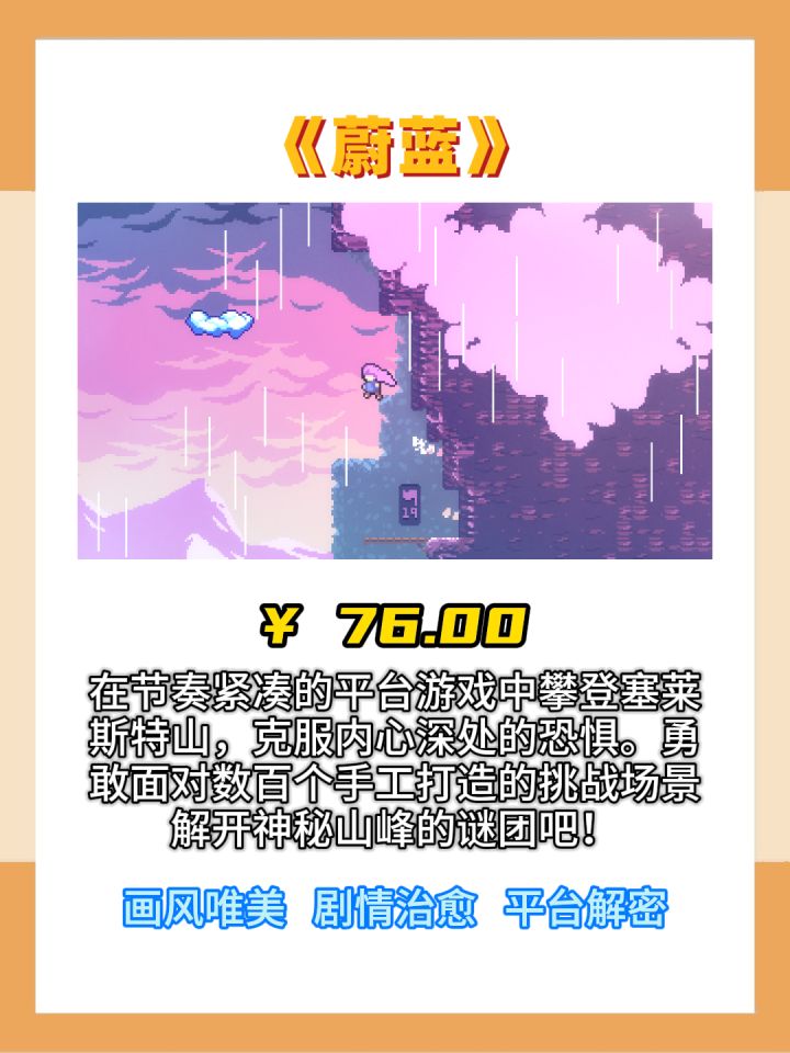 规定的是平台跳跃游戏,但是大家都知道他是空中飞行游戏,但是蔚蓝包好玩的呀!蔚蓝也可以说是剧情向游戏,他的剧情还是蛮有意思的,通关途中可以看看剧情,但是有的关卡比较难,我手一直敲键盘都敲的疼,但是能耐下性子玩的话也可以静心养性。蔚蓝a面的前八关通关途中可以收集草莓,普通草莓一共175个;通过b面后,会出现金草莓,不管那个面,每关的开头都会有一个金草莓,带着金草莓一次都不死通关就能得到金草莓,金草