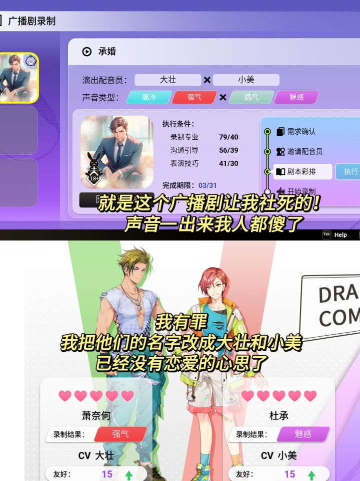 游戏:纯爱声放送平台:Steam游戏依然是经营快要破产的公司那一套,不同的是这次是经营录音工作室,有很多没见过的流程,很有新鲜感!游戏画面没什么出格的地方,就是录出来的抓是18+的(玩之前没注意官方提示,外放开得很大声的我已经准备移居外星了) 其他优点有:🎮小鼻嘎QQ人超级可爱!小表情巨萌!🎮画风很舒适,音乐也很在线🎮经营玩法做得很完善缺点:🎮几个男主人设比较古早