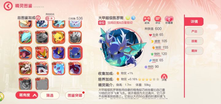 兄弟们!《口袋觉醒》虫队玩家集合!今天必须给你们安利一对“没它们就不算虫队”的狠货——大甲超级凯罗斯和虫王赫拉克罗斯!刚用它们打上竞技场前30,实测爽感直接拉满,看完你就懂什么叫“虫队脊梁”!【大甲超级凯罗斯:空域虫鸣审判官】蓝紫色甲壳带雷纹,白色鹿角翅膀一振就卷音爆云(图1),这颜值战力双A!- 技能「紫电瞬狱杀」:从天而降巨剪劈砍,激活“虫鸣武装”后百分比伤害灌满(图1技能描述),脆皮见