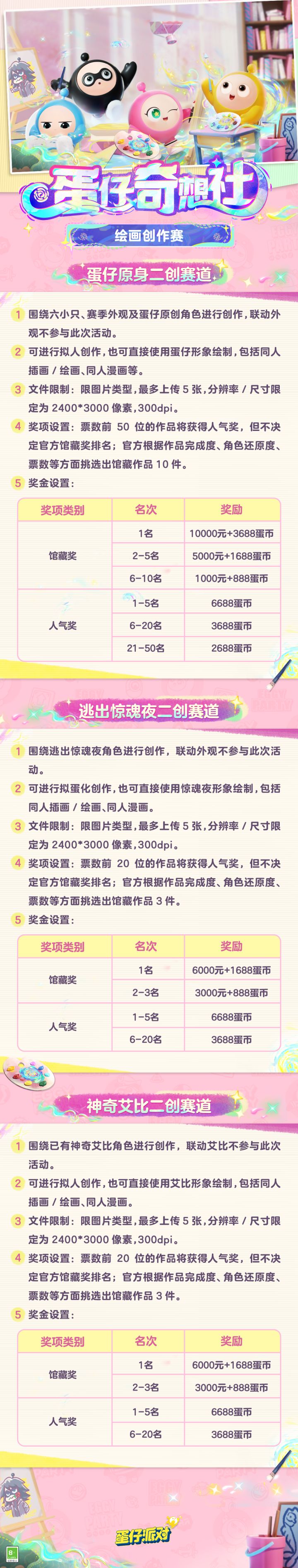 全体创作蛋们集合!「蛋仔奇想社」3周年同人创作大赛火热来袭~ 三大赛道、10w+创作基金、70w+蛋币等丰厚奖励等你来赢! 🎨创作时间:6月20日10:00至7月25日24:00; 🎨三大赛道:本次大赛将分为绘画创作赛、视频创作赛、COSPLAY赛三大赛道,其中绘画创作赛和视频创作赛均设置三个专项赛道; 🎨参与方式:创作蛋们可依据游戏已有内容,尽情发挥想象力进