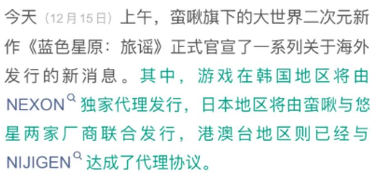 #今天游戏圈发生了啥 #资讯评论员 #蓝色星原旅谣 近日,蛮啾网络旗下备受期待的大世界二次元新作《蓝色星原:旅谣》于2025年12月15日正式公布其海外发行计划,针对不同区域市场精准匹配了顶尖发行伙伴:韩国地区由本土巨头NEXON独家代理,日本市场采用与老牌伙伴悠星的联合发行模式,港澳台地区则继续由专注二次元赛道的NIJIGEN发行据悉,蛮啾此次没有采用“一刀切”的全球统一发行模式,而是根据各