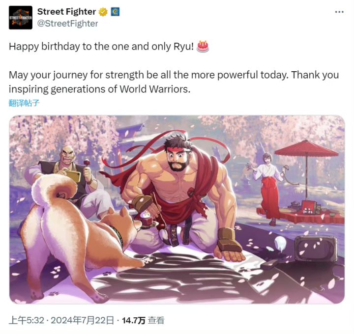 7/22号上午,《街头霸王》官方为系列男主角隆庆生并发布专属生日贺图❗❗❗贺词:“祝独一无二的隆生日快乐!愿你今天在追求力量的道路上更加强大”据悉,隆的官方设定为1964年7月21日生,今年60岁了日本游戏厂商怎么老喜欢给游戏人物过生日,也是奇怪了不知道大家怎么看?#今天游戏圈发生了