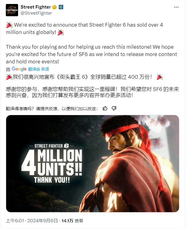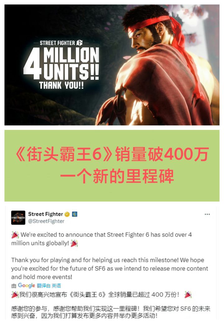 《街霸6》全球销量突破400万❗新的里程碑🎉🎉🎉