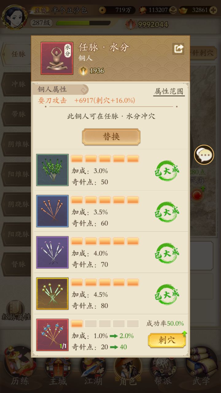 前言:本篇主要讲解如何提高实际战斗力,并非纸面战力。之前讲了上篇,那么这里开始讲解后面的部分。这里面其实也包含了一些游戏的基本知识,好了直接进入正题。看过上篇的朋友应该都知道影响无名江湖实际战斗能力的四大要素是什么,分别是:一,武学等级,二,淬锋属性,三,刺穴增减伤属性,四,装备特效的选择。上篇讲了前面两个,那么今天就讲三和四,也就是刺穴和装备的问题。三,首先说刺穴。刺穴所需的金针获取就是每日