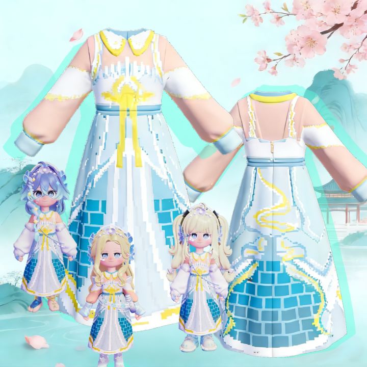 这款服装以王者荣耀西施的“游龙清影”皮肤为灵感,将国风美学与像素质感完美融合。 - 设计亮点:浅蓝渐变裙摆模拟水纹流动,金色龙纹刺绣在像素化处理后更显灵动,搭配通透的薄纱肩袖,营造出龙隐于水的仙气氛围。- 文化内核:整体设计提取了“龙”与“水”的传统元素,既保留了原皮肤的辨识度,又通过像素化的现代手法赋予其新的视觉语言,让国风在心动小镇中焕发新生。- 适配性:服装版型兼顾了美观与实用性,