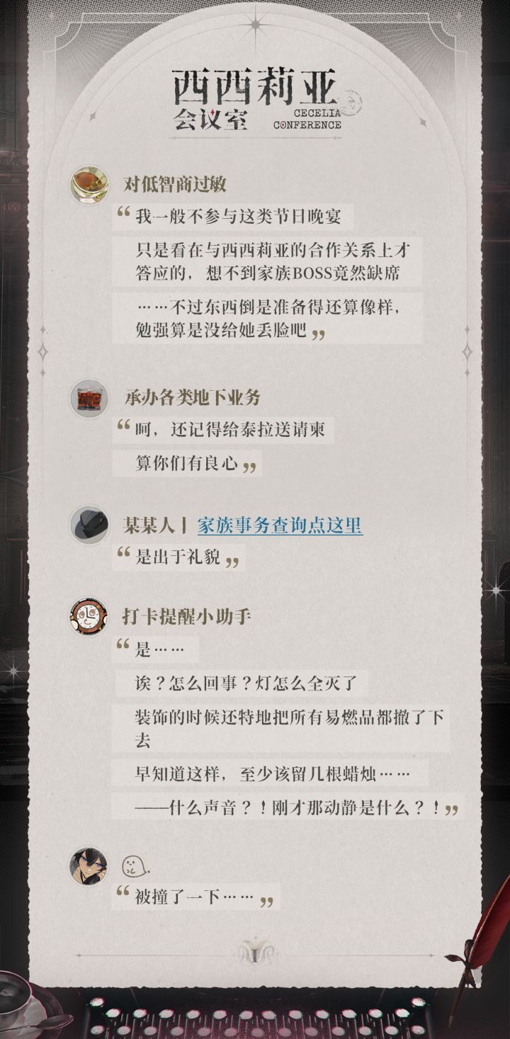 >>>截获未知加密通讯内容<<<■信号源:西西莉亚会议室.chat■内容识别进度:… 98%…99%…100%[已完成]▸自动提取关键词:密谋、失足、驱逐……?▸不对不对,这份家族会议记录的内容……似乎与BOSS的失踪有关?BOSS还是赶快亲自看看吧!#代号砰砰 #女性向游戏 #西西莉亚会议室