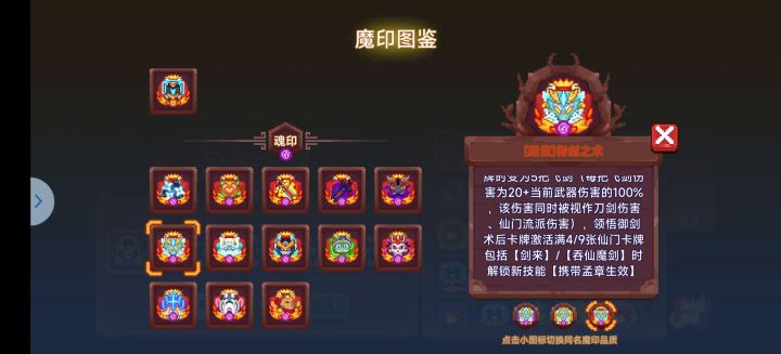 虽然御剑早已不是T0,但拥有一套完整的御剑卡组跟御剑印是所有见习萌新的梦想,毕竟你强虽你强但就解放双手跟游戏里的飞剑都足以证明帅是一辈子的事~小作文开始魔印篇:还是老样子御剑➕3穿云➕仙衣或者其他前面御剑跟3穿云最重要最后一个法印随意。卡组篇:人偶跟地图的作用我就不多说了,所有卡组基本都会用到,御剑术的魔印需要9个仙门卡牌包含魔剑跟剑来会解锁两个技能,一个是飞剑暴击时会多一个魔剑法阵同