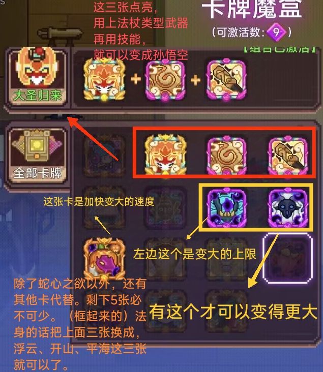 图一齐天大圣真身图二卡组推荐图三卡组必备说明。其中蛇心之欲可以换成其他带产业魂的卡。没有蛇心或者觉得业魂掉落慢的,可以多带产业魂的技能,甚至全带。图四伤害说明。主要是想说0星卡前期可以和大佬一起共度难关。不需要培养。变大需要,还会加一点伤害。图五选卡说明。我比较喜欢这些特效所以加这些。图六特效说明。其他特效可以替换,喜欢就可以换,比如太上真仙的法阵也不错。不过不知道队友看不看得,因为有的