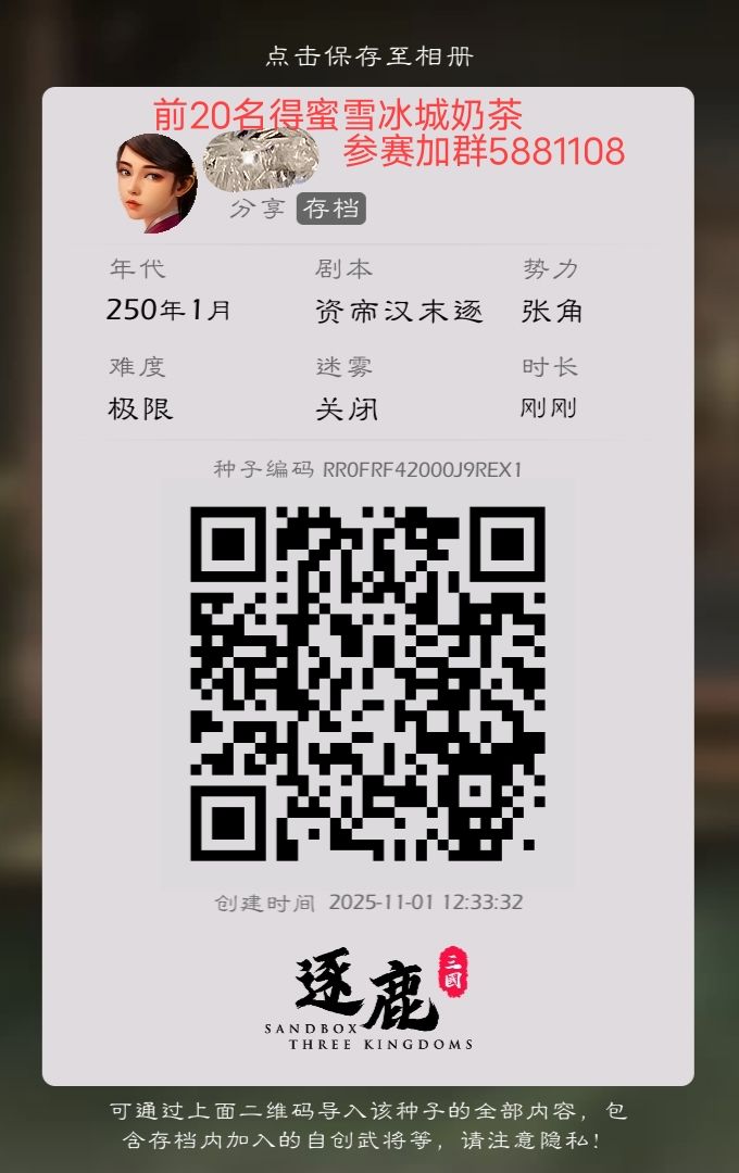 【20杯奶茶活动】活动介绍:感谢大家对【资帝汉末逐鹿】免费剧本支持,目前已经导入386人在玩。为此我举办此次活动。剧本介绍:本剧本是“存档种子”纯史实武将,没有加任何DLC武将。只需要开头自创地图➕自创武将即可玩。奖励说明:20杯蜜雪冰城奶茶(柠檬水)奖励率先统一全图的前20名玩家。奖励发放完活动就结束。参赛要求:每天至少截图一次发到群里艾特群主君陌看。截图内容为(小地图、子嗣列表