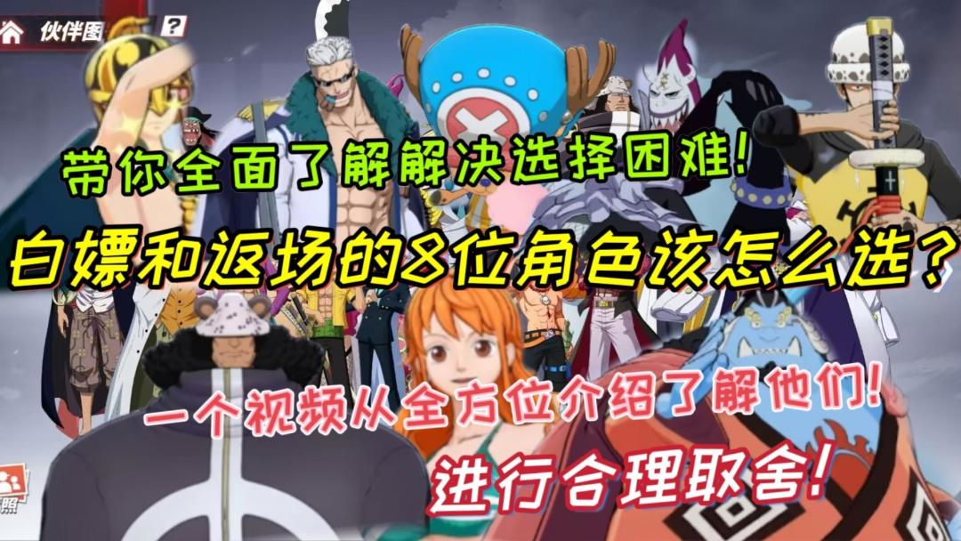 白嫖和返场的8位角色该怎么选?一个视频从全方位介绍了解他们!带你全面了解解决选择困难!进行合理取舍!仍没有三小只,pvp强度均在线,pve均不建议【航海王热血航线】#游戏推荐 #航海王热血航线 #白嫖 #角色返场 #解决问题 #PVE #PVP #游戏种草计划