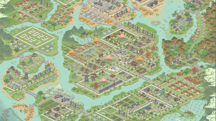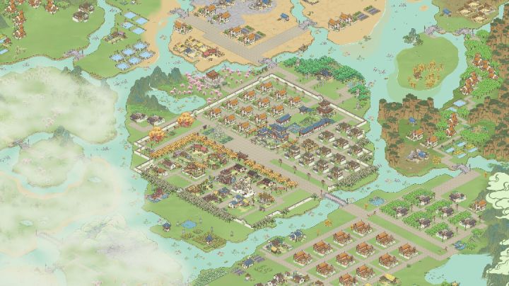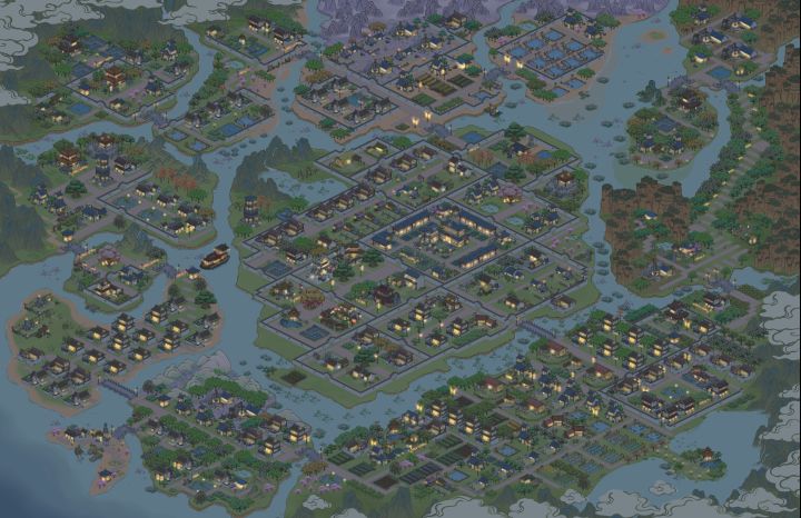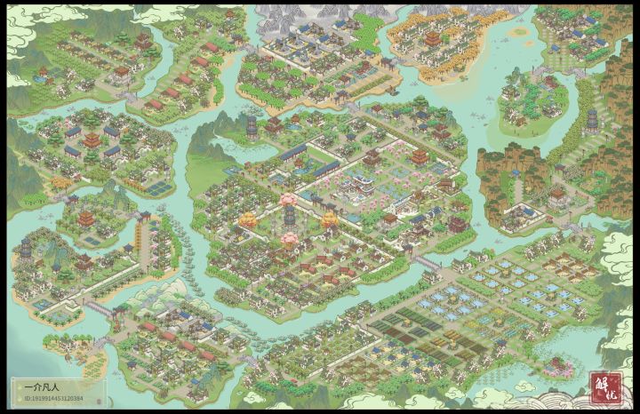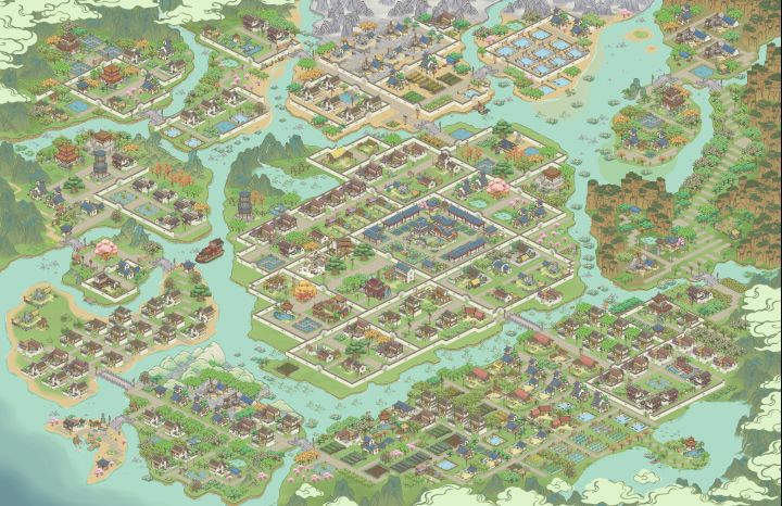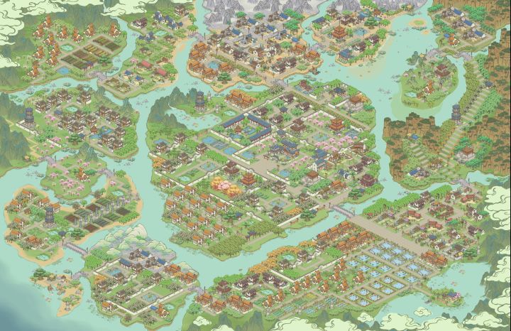 因为地图没有开全 目前为止就是士农工商这个顺序安排的远近 之后也不会有大的改动 会把树种满 景点添加完 希望支持一下呀中间区域就是 “士农”了对面小巧思 搞了一个集市左边部分是原材料制作类啊右边是商行这种 当官去消费的地方 包括驿站 还有过年活动得到的铺子 药铺之类加上围墙就是单独一个小城镇了外面打算种植一圈芙蓉树 (为什么是芙蓉树 因为它是粉色的我喜欢~)这一片区域因为有黄土就