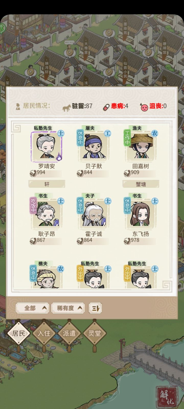 1.你觉得的女矿工可能是男的(鬼怪厌多也是男的)2.很多人没看到医馆治病怀疑医馆的作用,特此上图,救治很快所以不容易逮到,健康值低于一定程度才会自动去看病,看病只会恢复一定健康值,解热散给失眠人加100健康值,龙沙饮25,加的多所以说解热散有奇效,健康值800会痊愈,但是更夫捕快只要工作就会掉健康值,所以送礼治病意义不大,有医馆就没问题。3.阴气入侵,如图4,人物头像带紫框,挺帅气的,但是第二