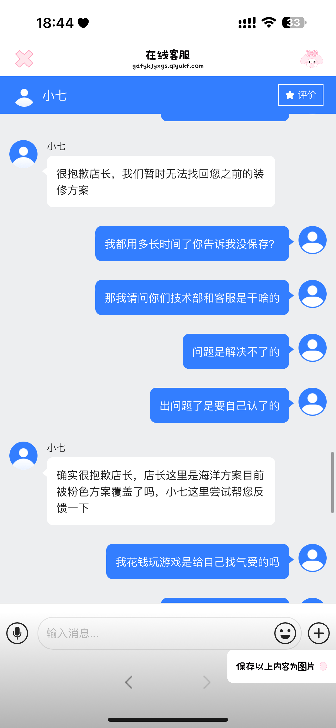 我连续用了好几天的装修你说给我卡没了就给我卡没了?你小四叶草一飘 一句店长大人稍等一下跟个魔丸似的就给我装修吞了?装修方案是互通的啊?嗯?你方案发明出来是干啥的?两次了 一搞个新的方案你就卡我把原来的方案给我吞了 什么意思?我一不是在覆盖原来方案的基础上建立的新方案我二没切后台没大退没断网也没切换网络你凭啥吞我装修? 上一秒方案名称还是海洋你小四叶草一飘让我稍等一下然后就自己给我切粉色去了?
