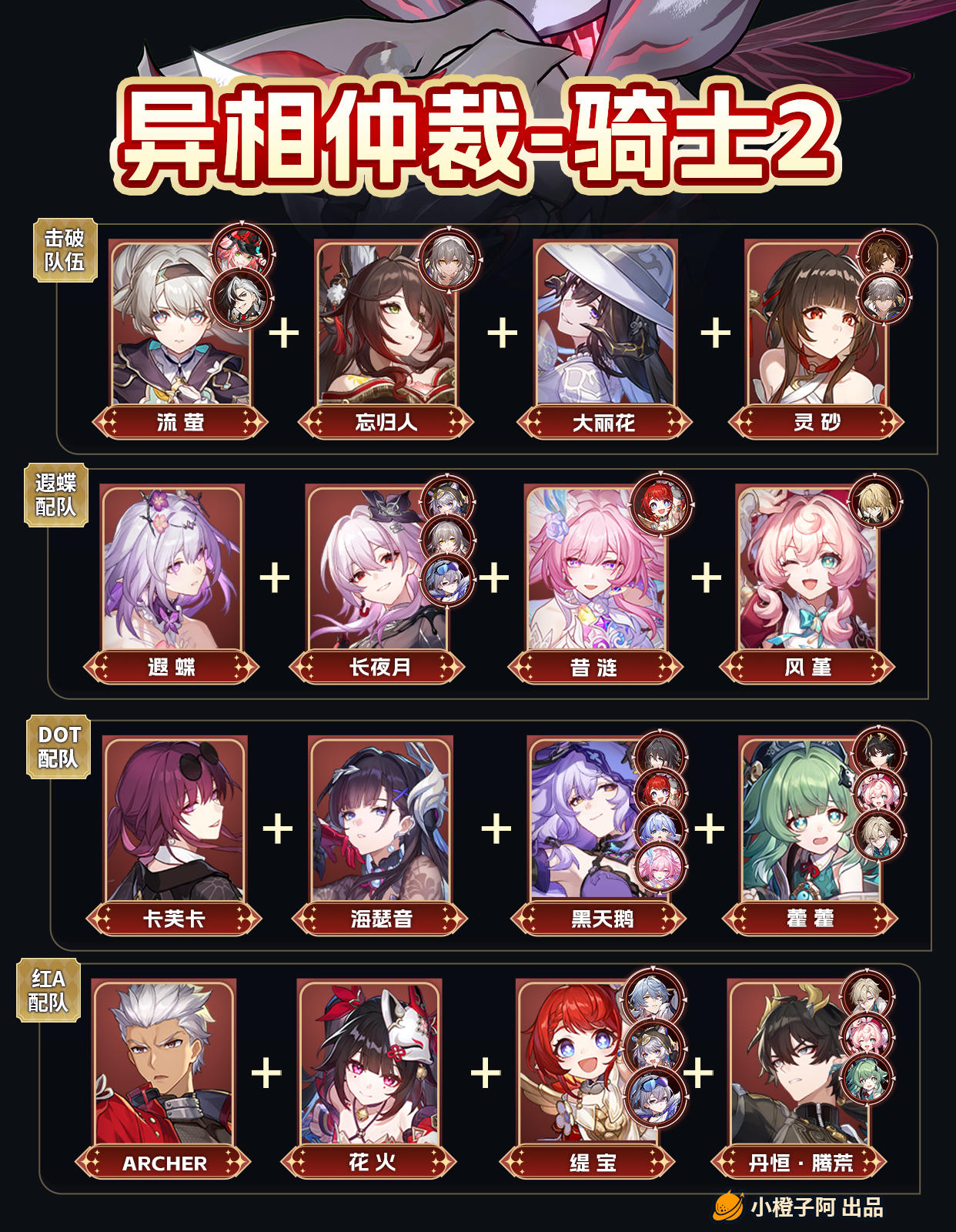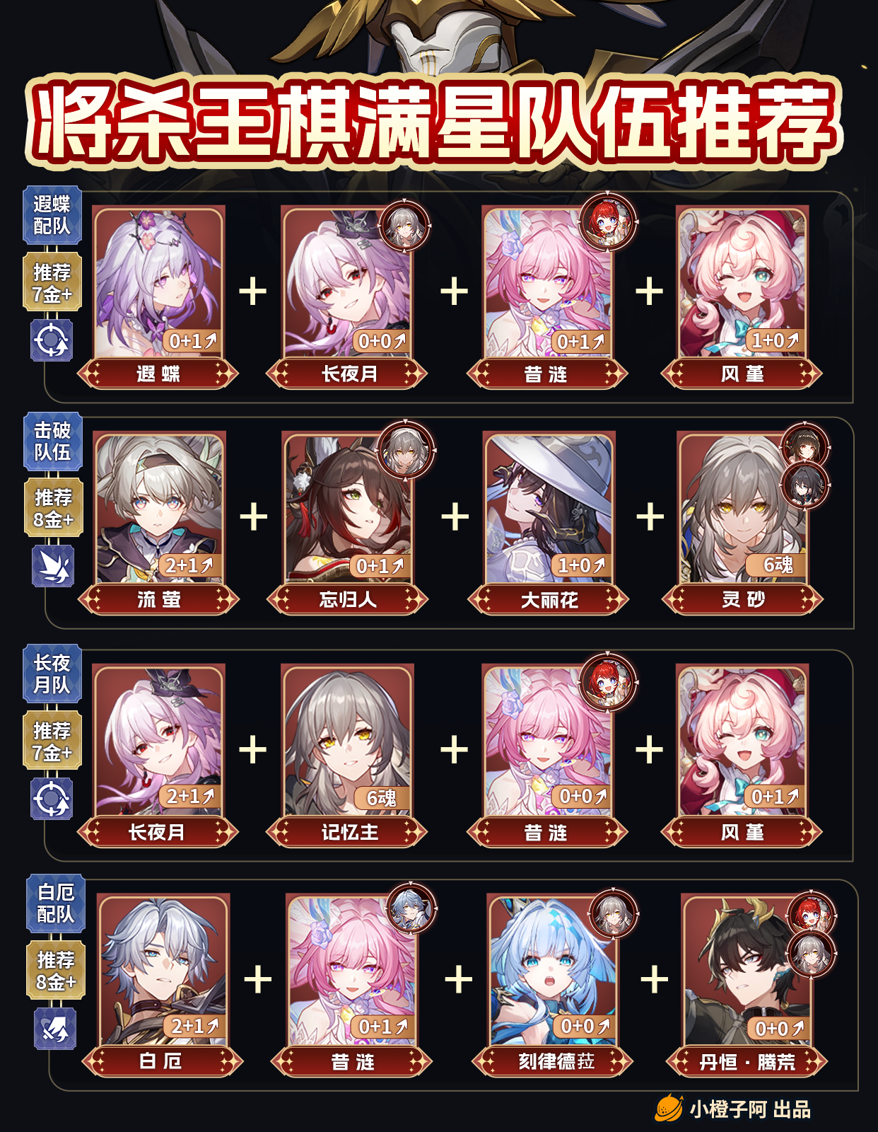 UID:104802274大家好哇,这里是小橙子阿,这一期橙子带来了异相仲裁的配队推荐。前期需要先过完【骑士】1~3关,相对比较容易一些,但是需要玩家至少有三个比较完整的队伍才行。如果记忆战舰配队配置较高,可选择拆分为遐蝶与长夜月两个队伍。将杀王棋难度再次拔高,想要满星不仅需要队伍有较高练度,对队伍整体金数也有一定要求。橙子在【将杀王棋】的金数以及单个角色推荐金数都标注配队当中,这个推荐