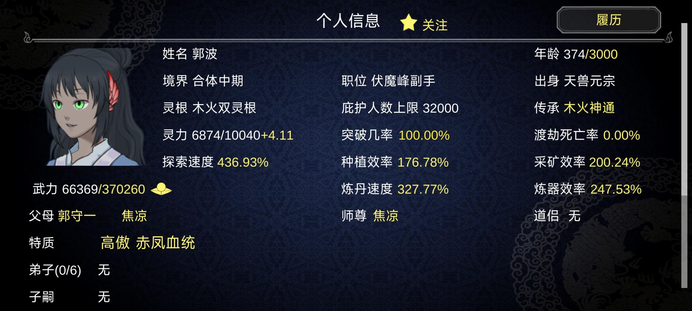 新存档掌门的三个子嗣 简称老大老二老三 目前看来老二这里天赋最好 老三就得看后代了 #论如何建立一个修仙门派