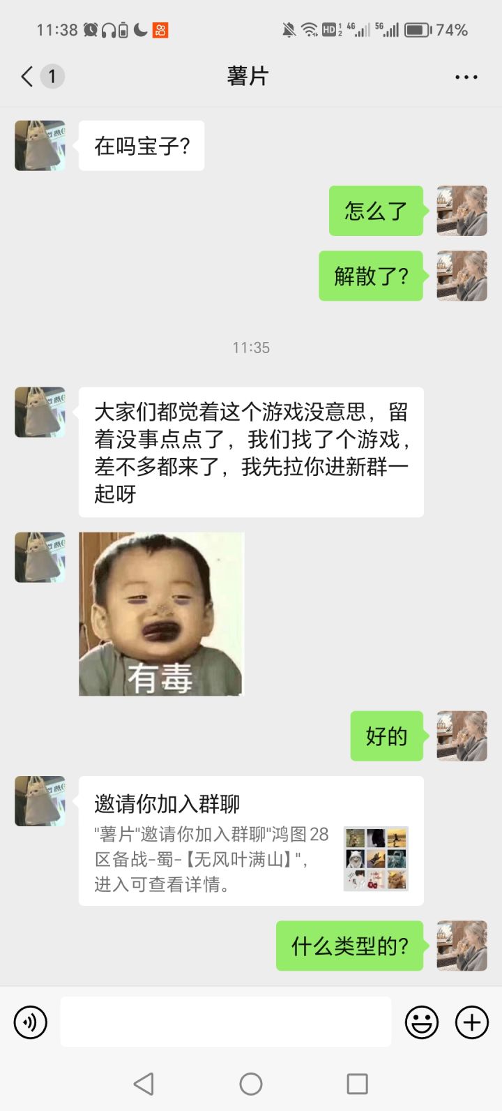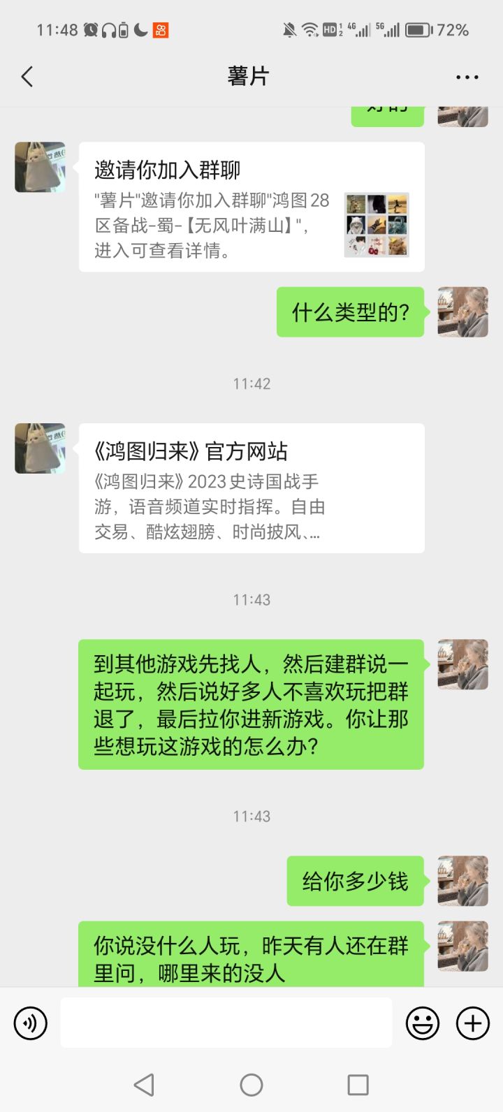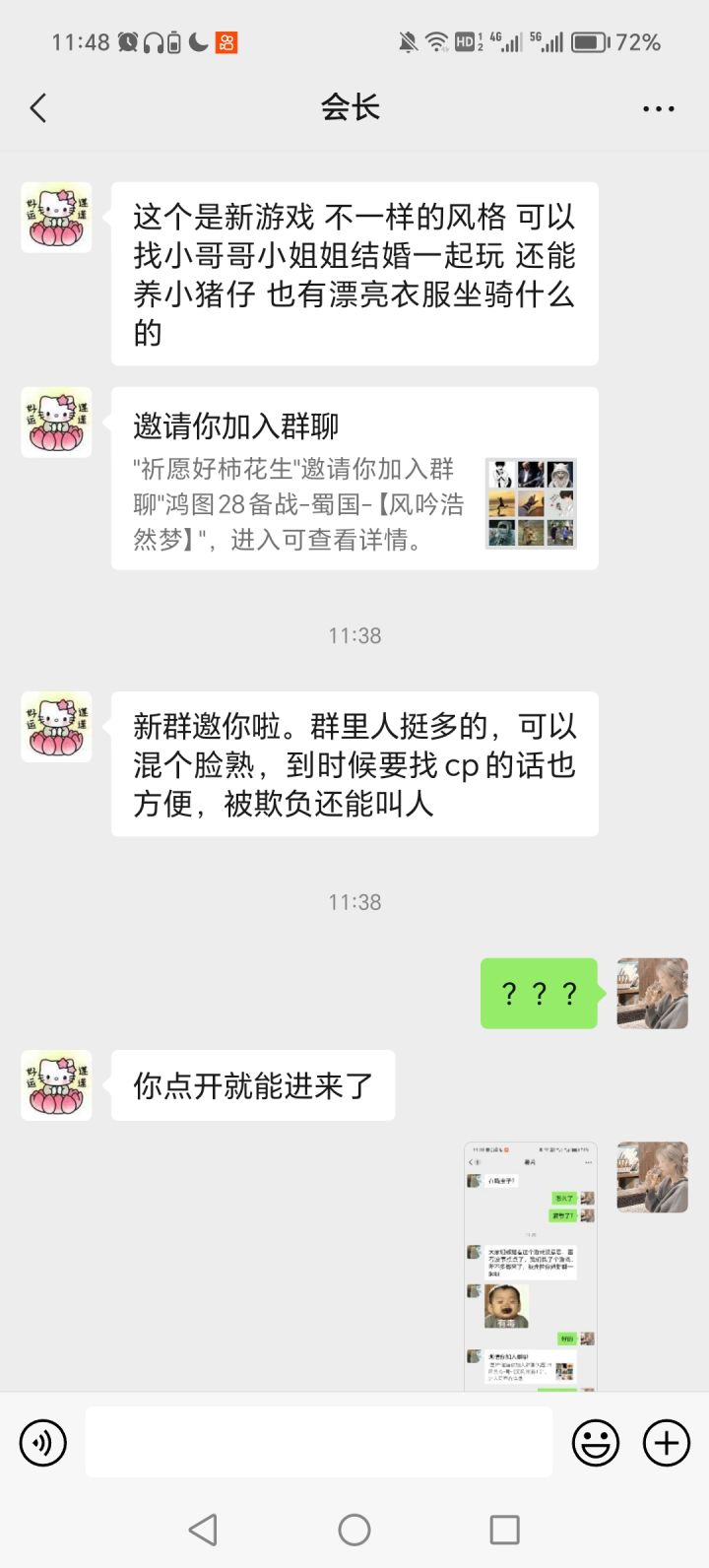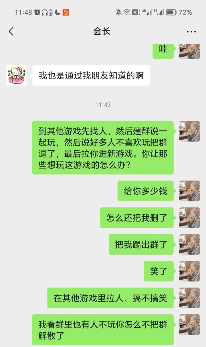 本人前天下载的游戏,昨天遇到一个人在游戏加我说是同好,有一起玩的群,我想着也行加一下吧,毕竟一起玩也比一个人玩好,大家还能讨论。结果,进了群以后,特别机智的把兑换码啥的先给了我们,然后到了今天突然把群解散说没法玩了,因为好多姐妹不感兴趣。然后又私信我说有其他游戏,两个人一个游戏,我去查了还是个网络三国游戏,劣质。官方能不能出个举报?人家打入你家内部挖你墙角啊?给我弄个举报啊!!!!真的气死了,明明