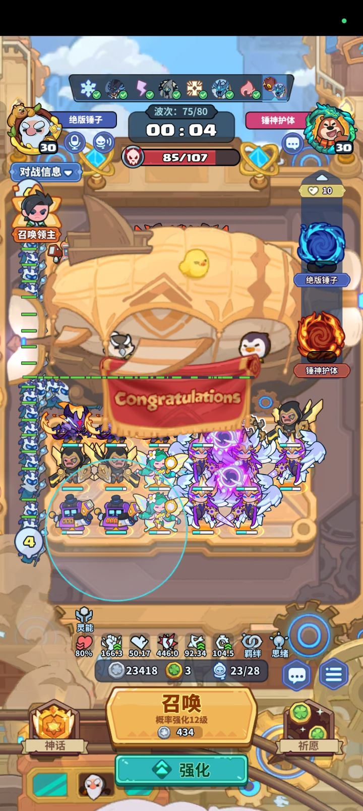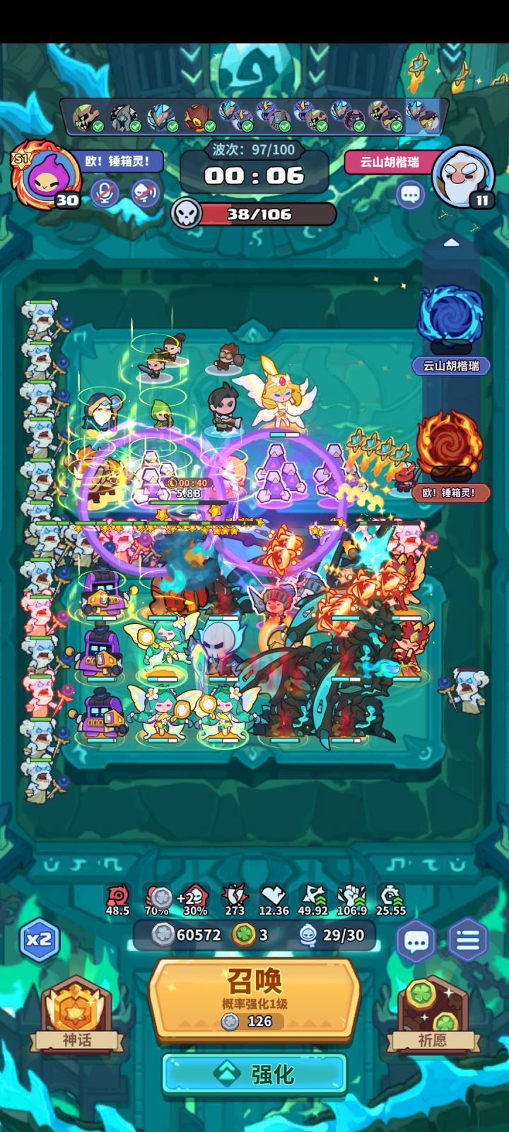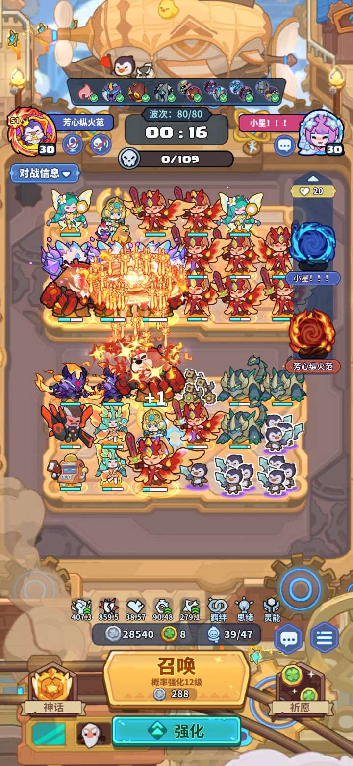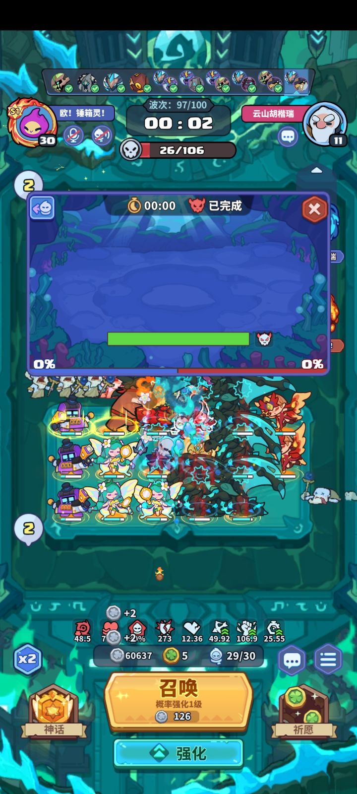 #该出奇兵啦 主C:60波之前 2妖精 8打币 2死灵60波首领第二次技能必定放「枯萎」,退2死灵3打币。然后补企鹅或者龙90波首领必有退场,退掉5打币,形成如上阵容站位。辅助:给主c传送1荧,3天使,一组牛头或者毁灭装置。50波大概率有传送,没有传送的话60卡首领时间等传送。