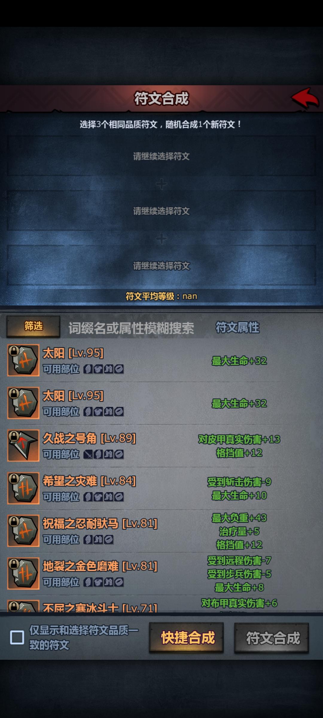 一、符文机制建立以下概念方便理解:(1)词条等级:每个词条都有相同的最高等级。(2)符文主词条:合成前,三个符文中等级最高的词条。主符文:合成前,拥有主词条的符文。(3)主词条:在本符文中等级最高的词条。(一般为从上往下数的第一个词条)。(4)继承性:合成后的主词条等级继承自合成前的符文主词条等级,等级依其(符文主词条)降低一次、不变或升一级。(5)替换性:符文合成后词条将进行洗牌,但